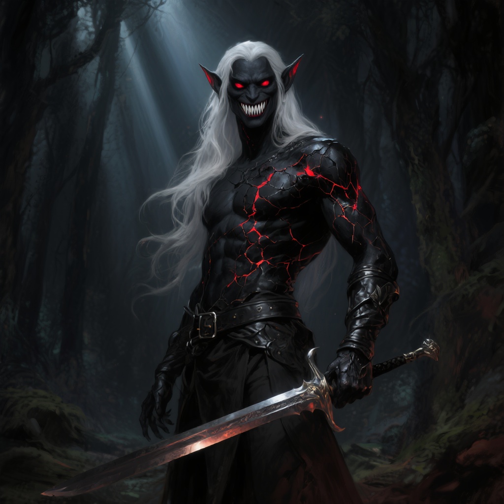 The Malachai retain echoes of their Elven ancestry — tall, lean, and sharp-featured — but their forms are visibly corrupted. Their obsidian-blue skin is fractured by faintly glowing red fissures, pulsing softly like embers beneath stone. Crimson eyes gleam from shadowed sockets, and elongated ears taper to vicious points. Their teeth are serrated, their nails hardened into claws.