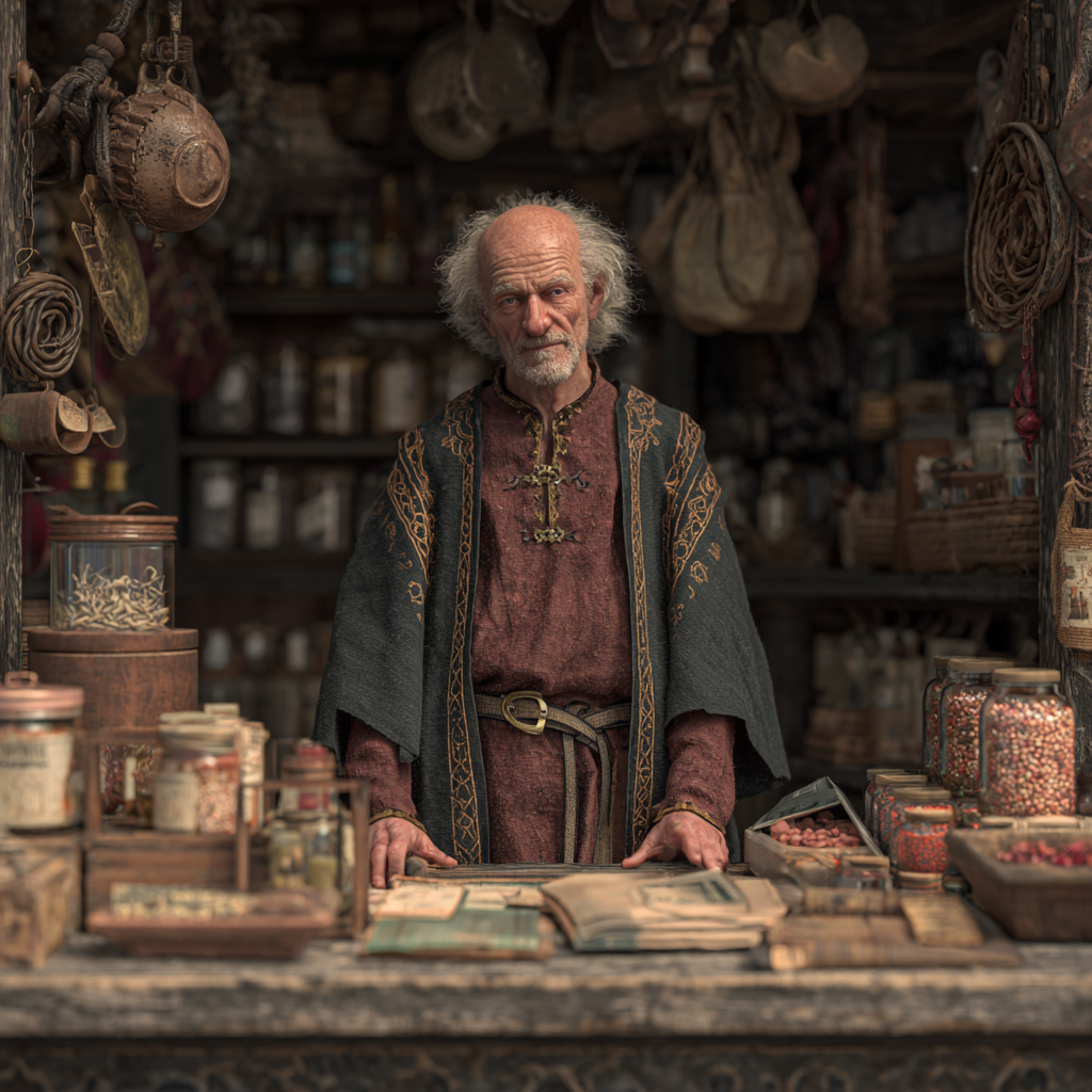 Aimeric, is seen a grumpy, with a strong local accent and money savvy. He hates thieves in general and will defend his shop from getting robbed by anyone. The Thieves of Frankia is tolerated by him as they sometimes need some of his wares such as rope, vials of oil or grease, inks and the like. They generally leave him alone outside of business and treat him fairly, with him doing the same though still keeping a wary eye eye when they are present.