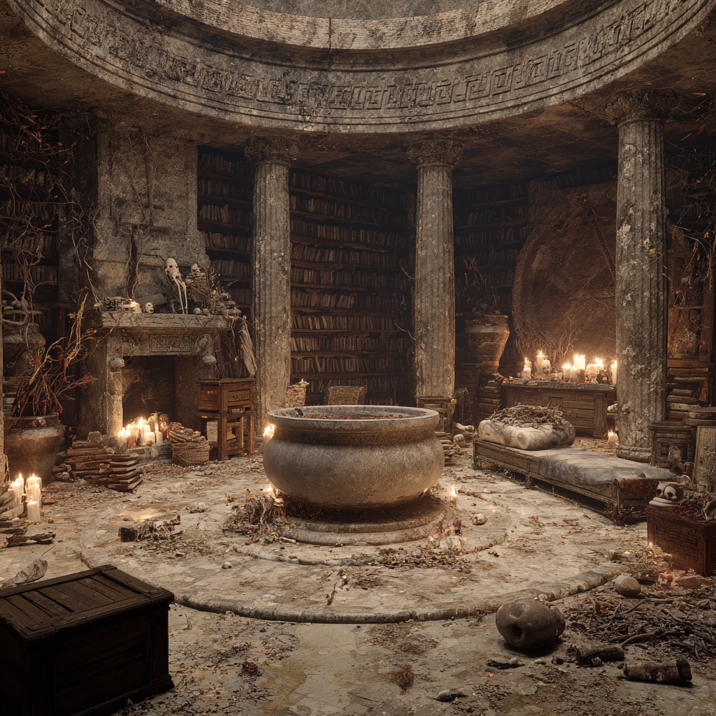Necromantiums are hidden ritual chambers, rooms, and buildings found squirrelled away in places that cover their use. Found in ancient Greece, the necromantiums are places that are used for the practise of necromancy.