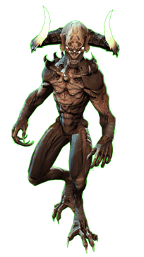 The type 10 or torus horror is a large minotaur-like hive horror. Two or more large bone protrusions rise from the horror’s skull used in combat to gore opponents. The horror has molted brown heavy hide-like skin, serrated claws, and long powerful legs giving it a speed advantage. However it has a far more dangerous ability. The torus horror has five white pupil less eyes which can cause confusion in the weak minded.