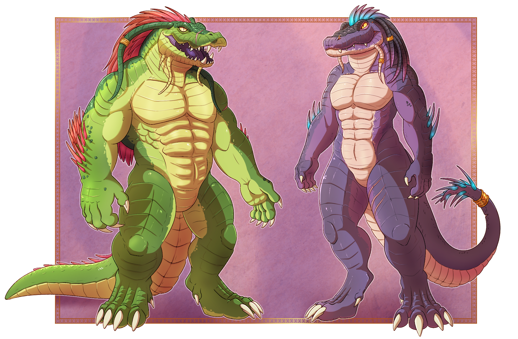 One of the most recognizable features of the kaimanid kin is their dorsal crest, a line of hardened, keratinous spikes that runs along the spine, often extending across the head, shoulders, and tail. These "crown spikes", as kaimanids call them, grow in striking hues of red, blue, purple, yellow, or even gradient tones that shift between colors. The pigmentation is hereditary, passed directly from parent to offspring, making the spikes not only a personal mark of identity but also a visible sign of lineage. The royal line of Thal-Kazuur bore unique pearl-white crown spikes, now believed to be extinct, which once signified their divine right to rule.
