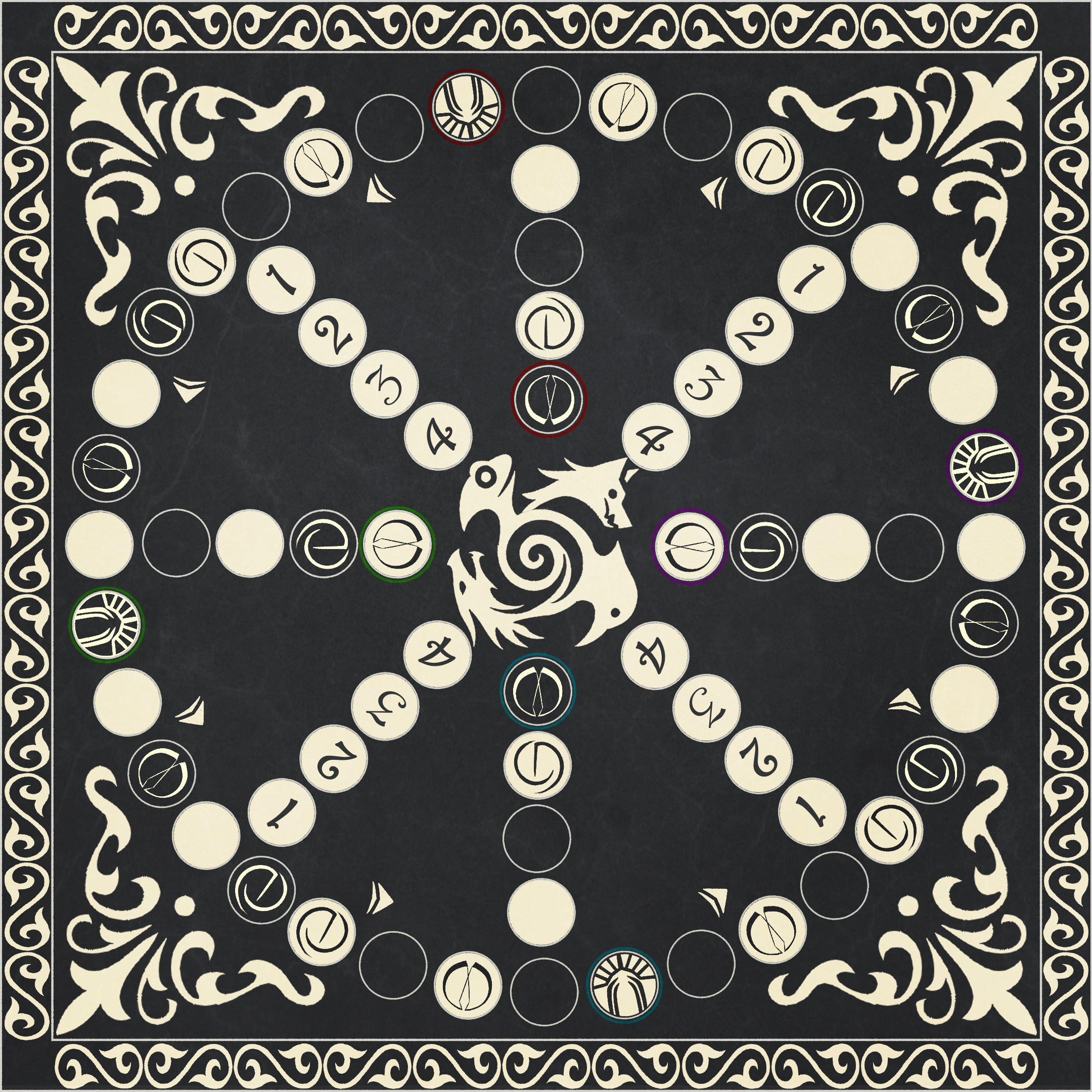 "There are folk who spy our squabbles betwixt the four tribes and reckonin’ us a prickly, unsociable lot. But truth be told, we relish gatherin’ together, be it to test our mettle, to feast, or simply to play. Take Swapstone Dice, for instance. Ye’ll find it near as everywhere in North Vespero, set out on wobblin’ tavern tables and inn floors sticky with old ale. Many a player tosses the stones without ever knowin’ the game was born here in Bittermarsh. Scarcely a soul among us who can turn down a game once the stones are rattlin’. In fact, I’ve wagered my own fair share in taverns far from home. Funny thing, that, once the dice are rollin’ and the laughter’s loose, folks tend to forget they were meant to eye a Zuqthiri witch like me with suspicion. I’ve seen more grudges soften over a game board than I can count. A shared game has likely stitched more peace into Bittermarsh than any diplomat’s pen ever managed. And it’s far more fun besides."Swapstone Dice is a popular board game most commonly found in taverns across North Vespero. The objective of the game is to move one of four distinct playing pieces—the Wolf, the Crow, the Frog, and the Dragon—from the board's edge to the center by rolling dice. The core strategy revolves around the fact that each piece is assigned a different point value depending on the progress of the game. As players near the goal, a key "swap" mechanic allows them to exchange their own piece or an opponent's piece. This is typically used to prevent a rival from scoring with a valuable piece, or to seize a better position for oneself. It is considered one of the oldest board games in Vespero, with scholars speculating it originated in Anatara as a variant of the game "Journey Around the Sun." The modern version popular today, however, was created in Bittermarsh and subsequently spread to the other realms. Traditionally, Swapstone Dice is a parlour game played between strangers in pubs, inns and taverns. Among the four tribes of Bittermarsh, it is customary to invite outsiders to join in a game. It is also frequently used as a form of gambling. Players contribute a fixed amount to a pot, and the winner receives the prize at the end of the game.