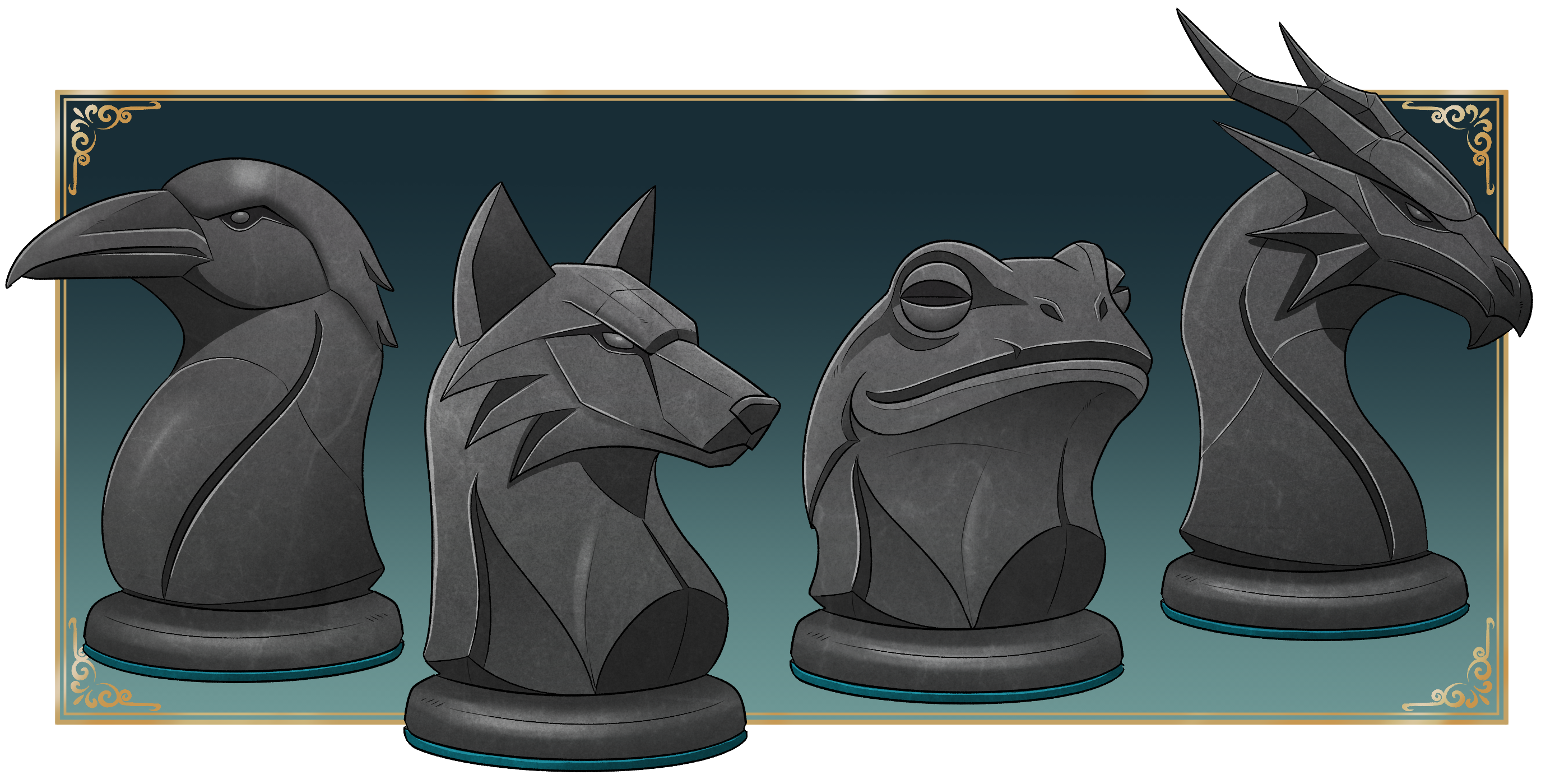 The most iconic version of Swapstone Dice is played with four pieces: the Wolf, the Crow, the Frog, and the Dragon. Historically, however, the game was likely played with literal stones, such as different colored riverstones or pebbles. The oldest surviving set uses flat stones with markings carved into them to tell them apart. While the exact reason for the shift to animal-themed pieces is a matter of speculation, a popular theory suggests they represent the major regions surrounding Bittermarsh: The Wolf stands for the Kingdom of Demenore, the Crow represents Morvathia, the Dragon is associated with Valleterna and the Frog is a symbol for Bittermarsh itself. At the start of the game, each piece is of equal value, so there is no strategic advantage in the initial choice. Nevertheless, regular players often assign personality traits to the type of person who prefers a specific piece. The Frog, for example, is said to represent humility and patience, chosen by players who embrace the chaotic, unpredictable nature of the game. A player favoring the Crow is considered intelligent and observant, often seen as an opportunist or schemer. Those who prefer the Wolf are viewed as strategic and ruthless, enjoying the thrill of the hunt, while a player starting with the Dragon is considered ambitious, proud, and straightforward. While the Wolf, Crow, Frog, and Dragon are standard, certain regions use a slightly different set of pieces. In the Silverwild of Thaldrune, for example, the Owl replaces the Crow, and the Bear replaces the Frog. The game is less popular in the Divine Dominion of Galdorsmynd, but it is sometimes played with the "Imperial Set," which features the Eagle, the Lion, the Horse, and the Chalice. Some older sets from Demenore used differently shaped knight figures, while some Valleternan versions featured different kinds of dragons. These variants are no longer in active play, as most taverns and pubs unified their sets to make it easier for travelers from different realms to play together. As a result, such old sets have become highly valued items for collectors and historians.Rules of Play