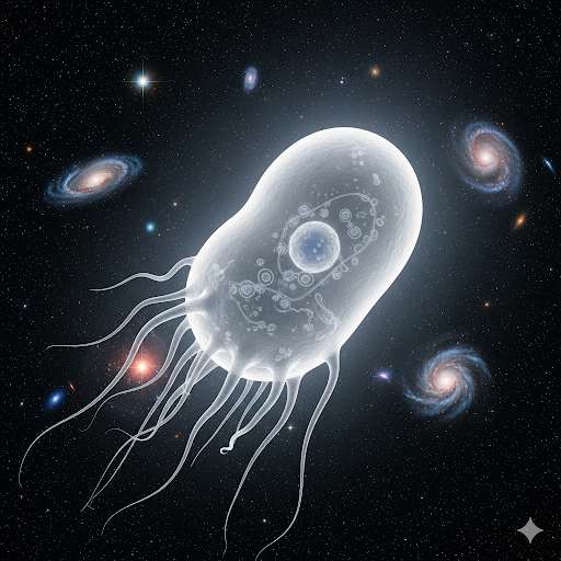 Void Amoeba is a single-celled organism, around 5 to 15 centimeters wide. They have a natural, white bio-luminescence, and many tendrils to eject matter into the void for movement. They have a transparent cytoplasm, meaning one could see the organelles floating around like cogs and wires, strangely