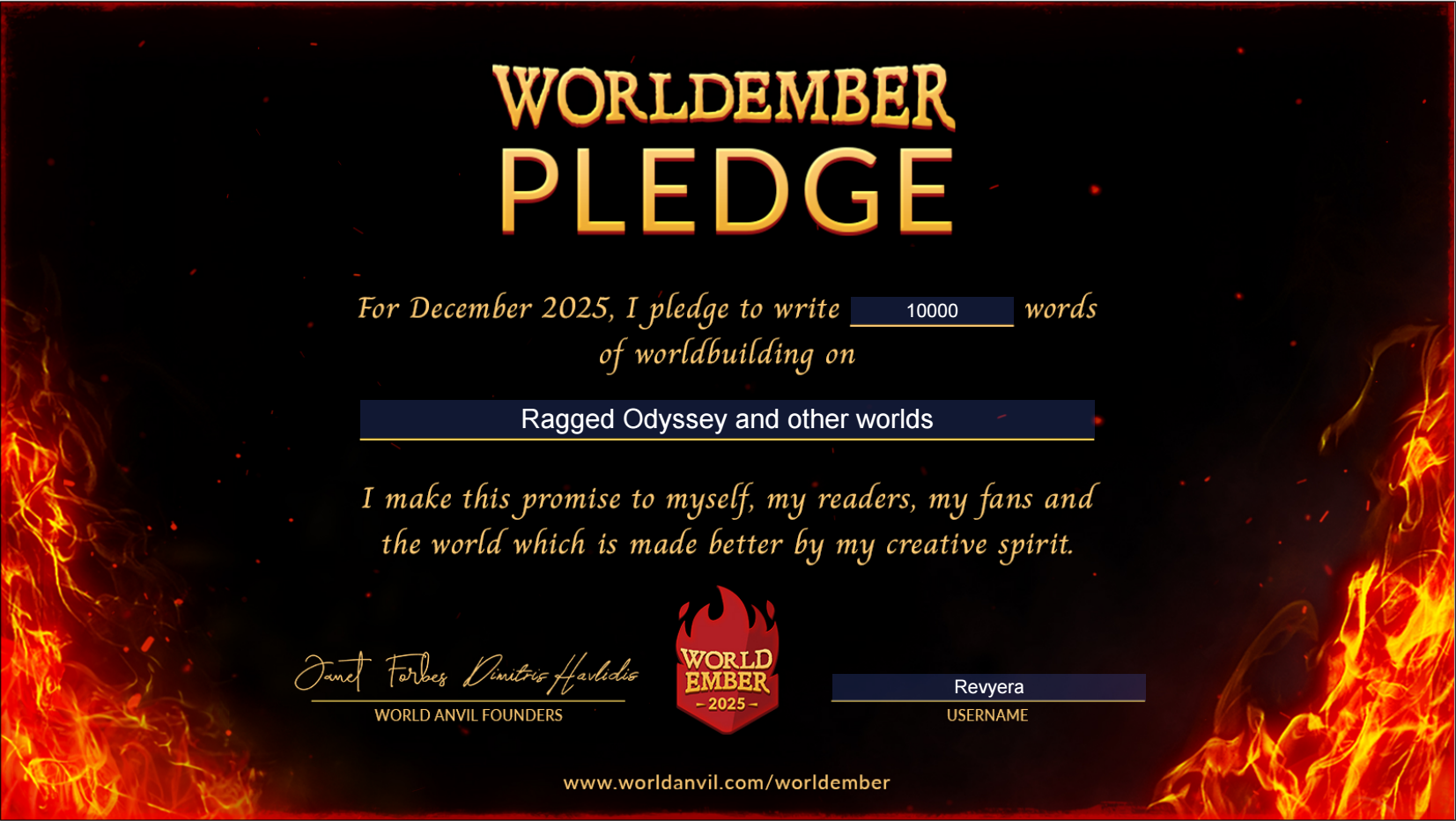 This year, I'm planning to finally write some of the articles I've either teased (this world's articles about Doubled Witch) or didn't finish in the past (The Call of Tree's bestiary), wanted to write for some of the challenges that I either missed or didn't have time to join in, and invite everyone to my new world, Ragged Odyssey. The ten thousand words are the minimum, and if I manage to reach one of the higher word goals, I'd be quite happy, but I'm not shooting for any other specific number.Goals: