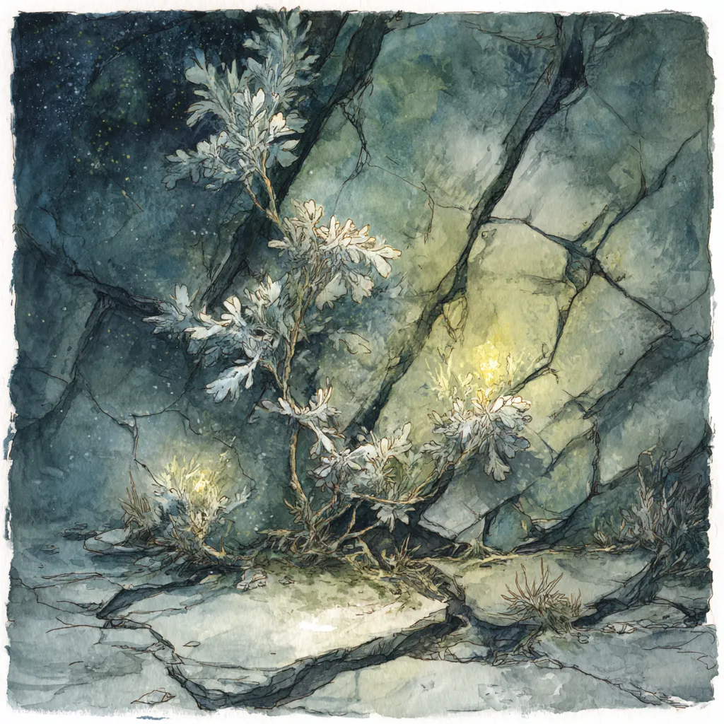 The most striking plant is the Moonlace Moss, a silver-tinted moss that grows across the cracks of glacial ice, glowing faintly under starlight.Moonlace Moss