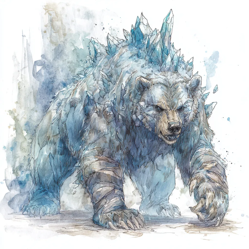 The major predator here is the Frostfang Bear, a colossal beast with crystalline shards sprouting from its back.Frostfang Bear