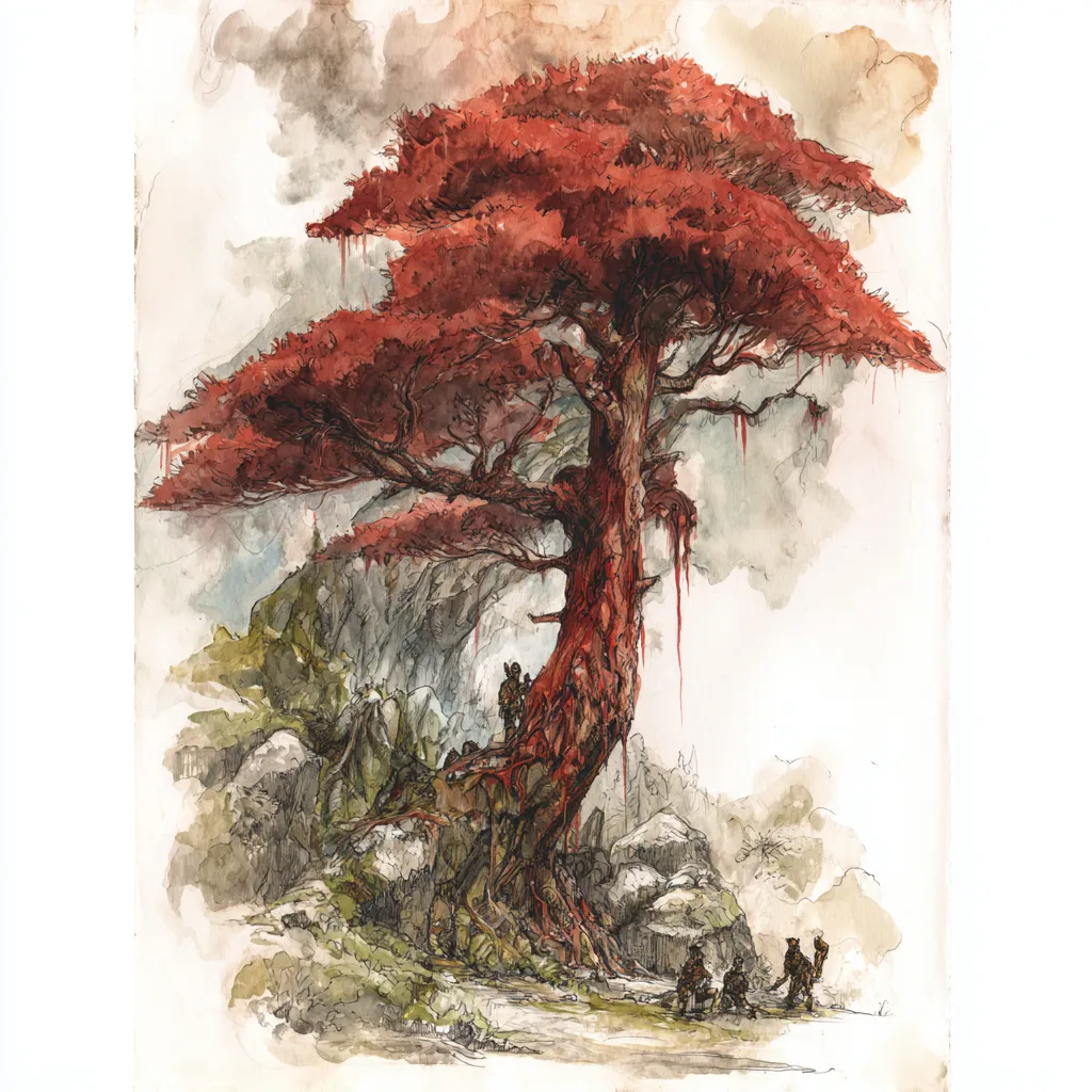 The Bloodpine Tree dominates the forests, its reddish bark oozing a resin said to ward off sickness. The wood is tough but burns with a strange, fragrant smoke.Burning Bloodpine
