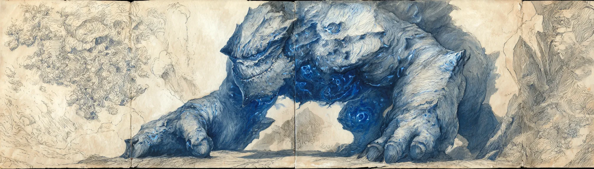 Aru’Nash was one of The Titans of Origin, wrought in the forges of creation by the ancient sorcerer-kings who once ruled in the age before reckoning. While others among its kin were moulded to embody storm, flame, or sky, Aru’Nash was bound to the essence of water, the secret veins that run beneath the skin of the world. The sorcerer-kings, fearing the chaos of wild magic, chained these elements into sentient vessels, believing that form could tame fury. Aru’Nash was meant to be a silent guardian, a regulator of the deep flows that sustained the land’s pulse.