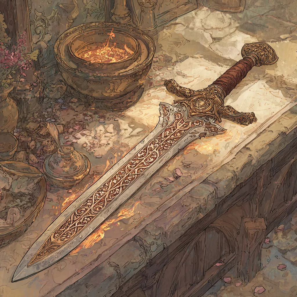 Hearth's Comfort (Passive, out of combat): While the blade is drawn and no open hostility is occurring, the bearer and allies within 5 yards count as sheltered from cold and damp. They gain +20 to Endurance Tests vs. Cold Exposure, ignore the first level of Fatigued from harsh weather, and may sleep in inclement conditions without penalty. Ashbond sheds steady, smokeless light equivalent to a lantern. Banked Ember / Battleflame (Stance): Outside combat the sword sits banked, radiating gentle warmth. When Initiative is rolled - or as a Free Action - the bearer may kindle Battleflame for the scene. Banking it again requires a Full Action and a moment's calm. Hearthfire in Battle (Battleflame only): Melee attacks deal +1 Damage (Fire, Magical). On a Critical Hit or when you win the opposed Melee Test by 6+ SL, the target must pass Agility or gain 1 On Fire Condition (flammables ignite at the GM's discretion). Creatures with Bestial must test Cool or suffer Broken for 1 Round the first time they are struck by Ashbond's flames. Keep the Threshold (Oath): When defending a home, sanctuary, or agreed truce-place, begin combat with +1 Advantage and gain +10 to Cool Tests to resist Intimidated or Broken. Notes: In its banked state the warmth is discerning - it will not harm those under your stated protection. In Battleflame it behaves as honest fire.