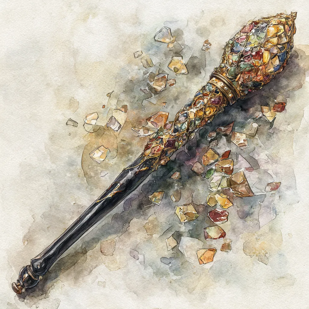 A blackwood sceptre inlaid with fae glass shards, crackling with oath-binding enchantments.