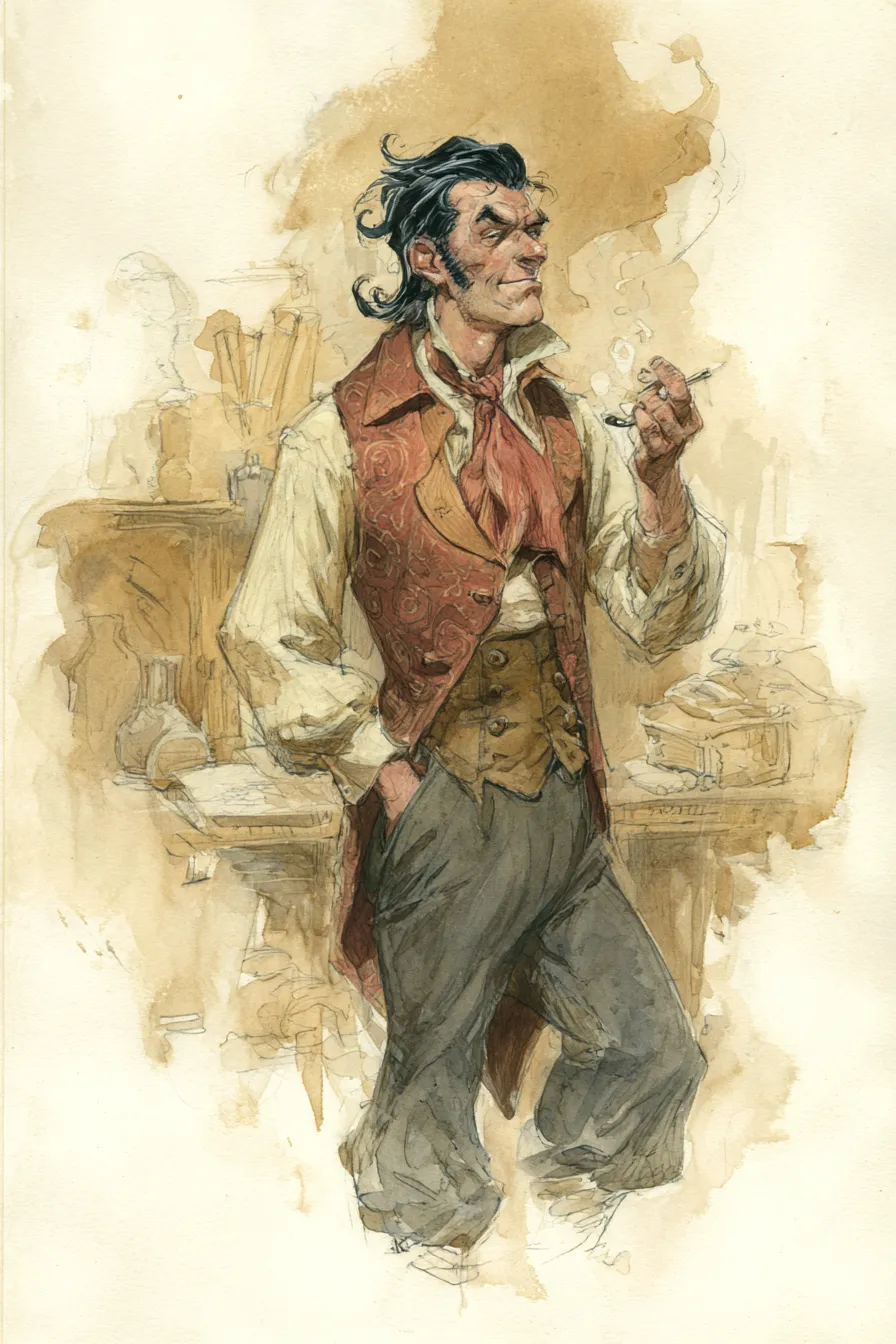 Fennick is wiry, with slicked black hair, an ink-stained waistcoat, and a smile like a fox at a henhouse door. He always smells faintly of ink and cinnamon (the latter from the sweets he chews constantly to "keep his tongue nimble"). His tongue is as swift as his fingers, sharp with charm and quicker still with excuses. He can coax a bet out of a priest, soothe an angry sailor with flattery, and talk a watchman into overlooking a ledger full of cooked numbers. When his words falter, his hands pick up the trick - shuffling coins, tallying odds, or quietly palming a slip of paper into his sleeve.