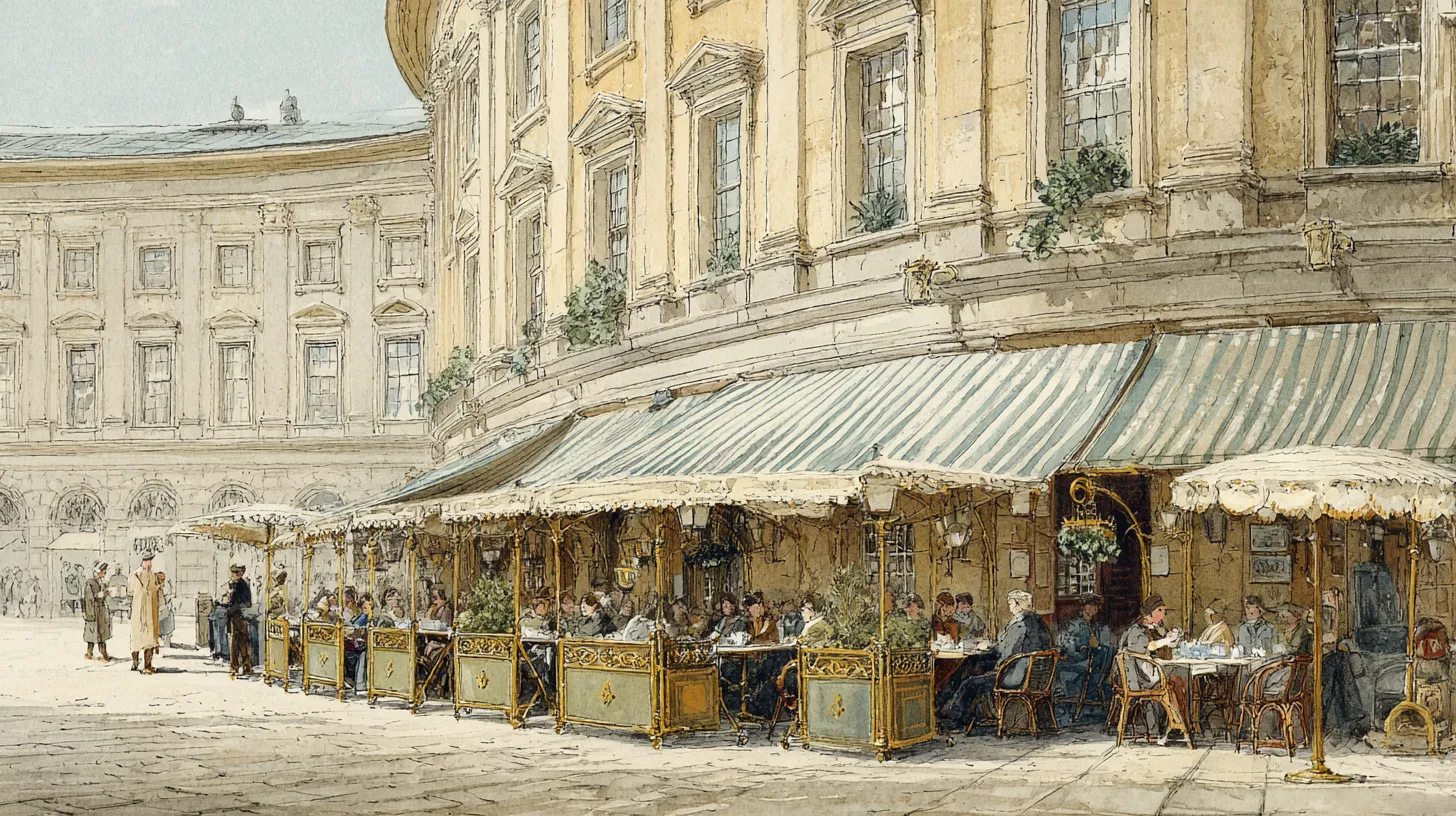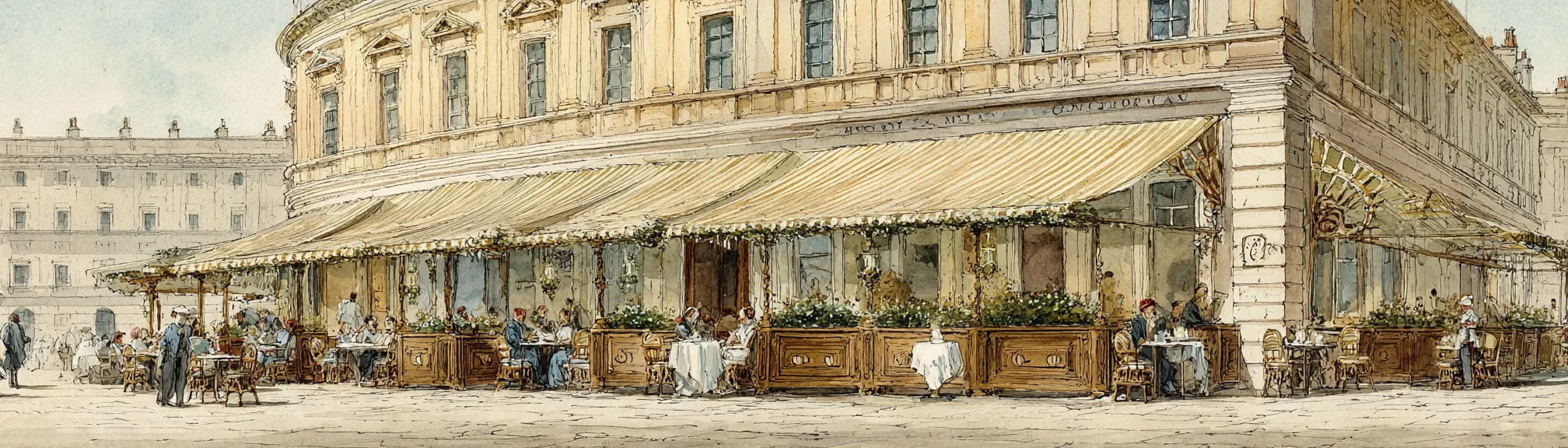 Marwick’s Place stands at the east-side of King’s Corner district, where the steps of the Speaker’s Corner descend toward the plaza. Its pale stone façade curves neatly around the street, its long row of small tables and chairs set beneath a striped awning. At first glance, it appears no different from any other respectable café - until one looks twice. The tables outside are divided by low partitions fixed to the wall. Each partition bears its own character: one carved from oak darkened by age, another of painted tin dulled by rain, a third wrought in ornate iron, and a fourth paneled in brass traced with tiny stars. The furniture and tableware follow suit, though never quite in the same style twice. The table in one section may gleam with fresh varnish, while its neighbour looks worn smooth by generations of elbows. Elegant tableware becomes earthenware, enamel turns to porcelain, and glass shapes change between different café sections. A slow walk along the café front feels like passing through a gallery of times, each table set within its own fleeting century. And during the next walk passing by they may look different once more.