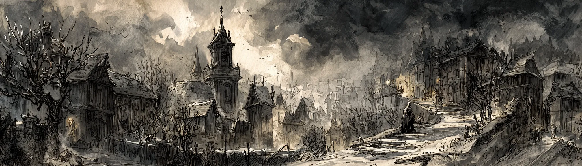Those who were there insist the first sign was not cold but quiet. Street cries dwindled to whispers that seemed ashamed to travel; the bell of Saint Celandine gave three dull thuds and would ring properly only months later after being rehung. Rime crept across cobbles with a slow, almost deliberate advance. It did not glitter. It did not catch lantern light. It swallowed it. In the harbour, mooring ropes went rigid and snapped with a dry pop. Fish floated belly-up beneath a lid of thin, smoky ice, as though the sea had taken a deep breath and held it too long. In Honeywell, hedges drooped under a black glaze, the roses sealed in perfect, breathless prisons. The villa windows of the leisure set showed silhouettes moving briskly between rooms, carrying kettle to brazier to fireplace, none of it helping very much. In Pigtown, pipes split; in Harehall, the snow turned a sort of dead grey where the frost settled deepest; in the workshops upriver, carefully kept thermometers gave readings that scholars still argue over because the bulbs themselves went opaque. People were marked by the frost. Some were kissed by it lightly and kept only a memory of pins and needles. Others suffered "frostburn" - dark, leaf-shaped scars that never wholly faded, as if a winter leaf had pressed itself into their skin. A few who breathed the night air too greedily developed the Quiet - weeks where their voices would not carry more than a few feet, no matter how they shouted.- The Black Frost was not merely cold; it was a hunger for heat.