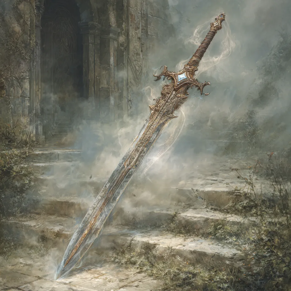 Most blades are forged to draw blood. But Truebound was forged to draw a line between what is here and what is elsewhere. At first glance it is a slender hand-and-a-half sword of moon-pale steel, its rippled blade glimmering like frost on black water. The crossguard holds a thumbnail shard of opalescent stone that never quite settles on one colour; tilt it and you catch a starfield that isn’t yours. From the pommel ring trails a hair-fine filament of light only the bearer can see, forever tugging toward “home”. When planted tip-first into earth or deck plank, it sings, a clear, steady tone that quiets echo and doubt.