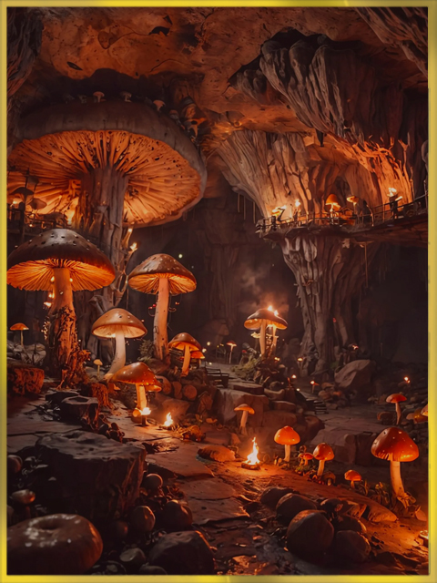 Natural caverns with wild myces are the oasis of the Night Below with many herbivorous creatures gathering due to the food and water supply. This also attracts the carnivorous predators for the hunt. These caverns are few and far between. Which has only grown rarer over time as they are usually taken over by dwarves or Juhl'are, with a town forming up within.