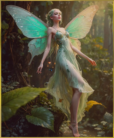 Nhanah wings are described as being butterfly like. Omona wings are usually smaller than their Seblug cousins, and far more dragonfly like. These wings are semitransparent and can be of any color. They will glitter in natural sunlight. There is a social hierarchy among the fairy, with lighter colors considered more favored than darker. Females seem to have more pastel colors over the male's darker colors. Greens and blues are most common for both. Seblug fairy skin is often ivory like or near white, sometimes with a green tint. The Omona fairy skin appears similar though often with a glint of blue. This differences, however, have largely vanished as the two peoples mixed over the generations. Fairy haircolor often match their wings, with blue and green being most common, though this is not a forgone conclusion. Like all of their kind, Nhannah have completely black eyes. Ancient fairies were known to wear leaf and flower petal clothing. The style remains in the modern day, though more artificially created with silks rather than using actually leaf or flower.