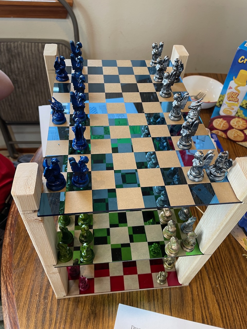 Dragonchess is a 3d chess varient by Gary Gygax https://en.wikipedia.org/wiki/Dragonchess