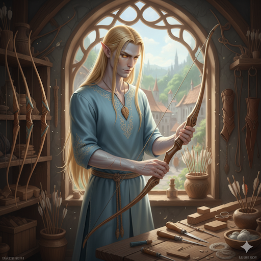 Calyndor arbeitet mit einer fast fanatischen Hingabe, die seine ruhige, ernste Art erklärt. Er spricht nur mit jenen, die seine Kunst wirklich schätzen. Seine Kreationen, von einfachen Jagdbögen bis hin zu magisch verzauberten Meisterwerken, sind in der ganzen Region bekannt und so geschätzt, dass er sogar die Stadtwache von Maarikest mit seinen Waffen ausrüstet.