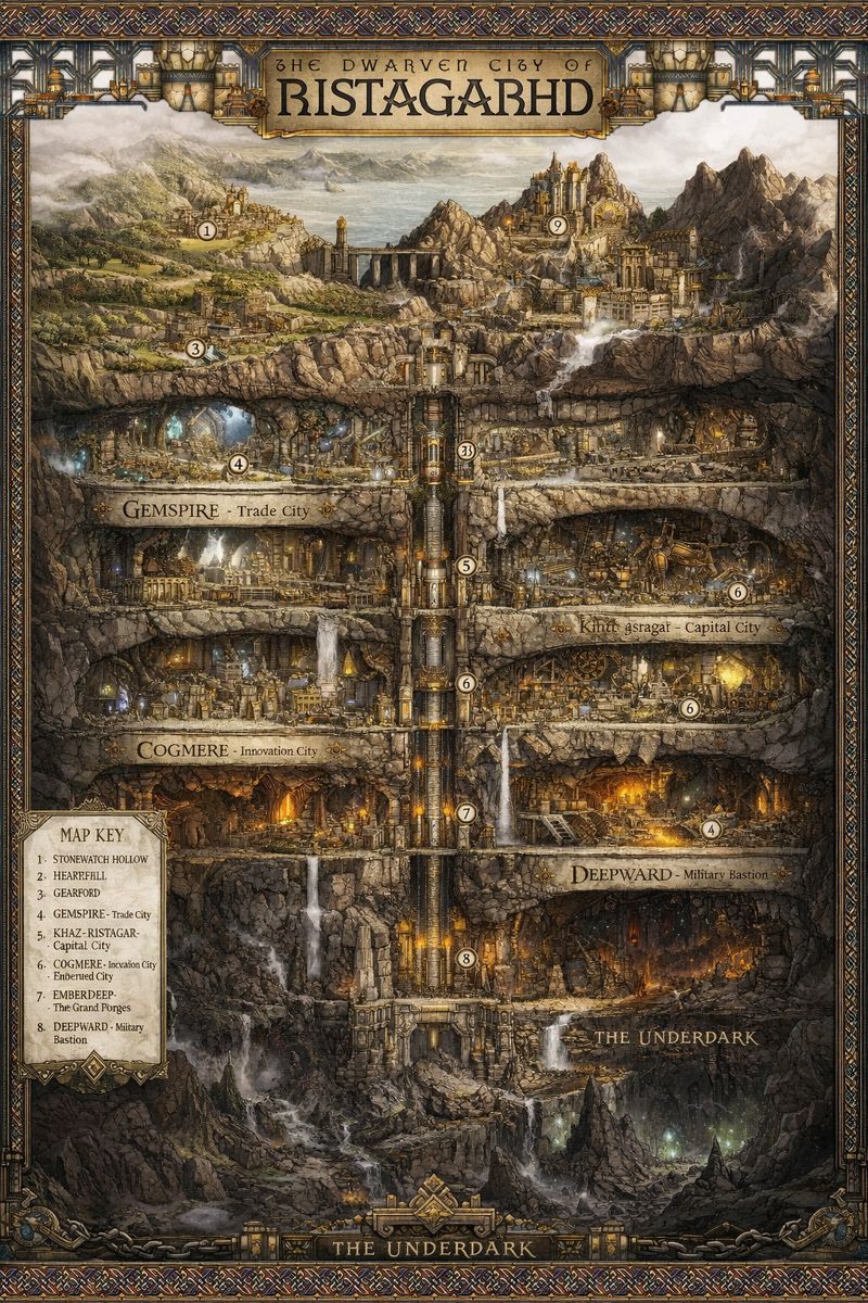 Description: Khaz-Ristagar is a city carved from a single mountain’s core. Entire districts are stacked vertically, connected by ramps and lifts. The High Forge, Council Vault, and Ironbeard Hall are located here. The city glows with warm amber light from enchanted crystals embedded in the stone.