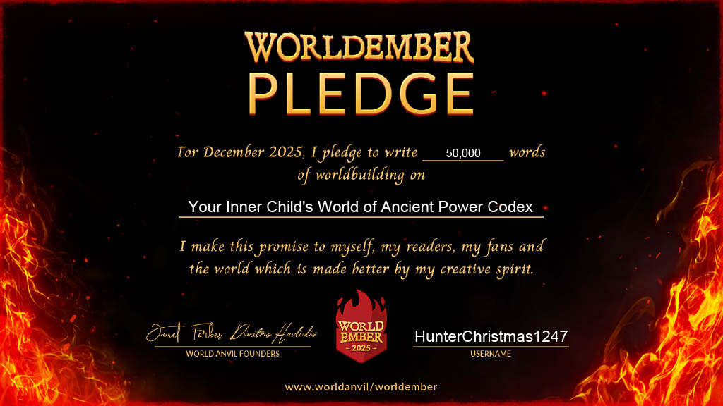 This WorldEmber, I’ll be mainly focusing on Ancient Power's Codex: Your Inner Child Book Series World. I am starting December with all known pre-book articles before getting into things that first appear in Your Inner Child: Baxter as Guardian and Your Inner Child: Baxter as Father Christmas as per List of Spoiler Articles. It is not a list in stone at this time. It is changing based on where I put chapters.
