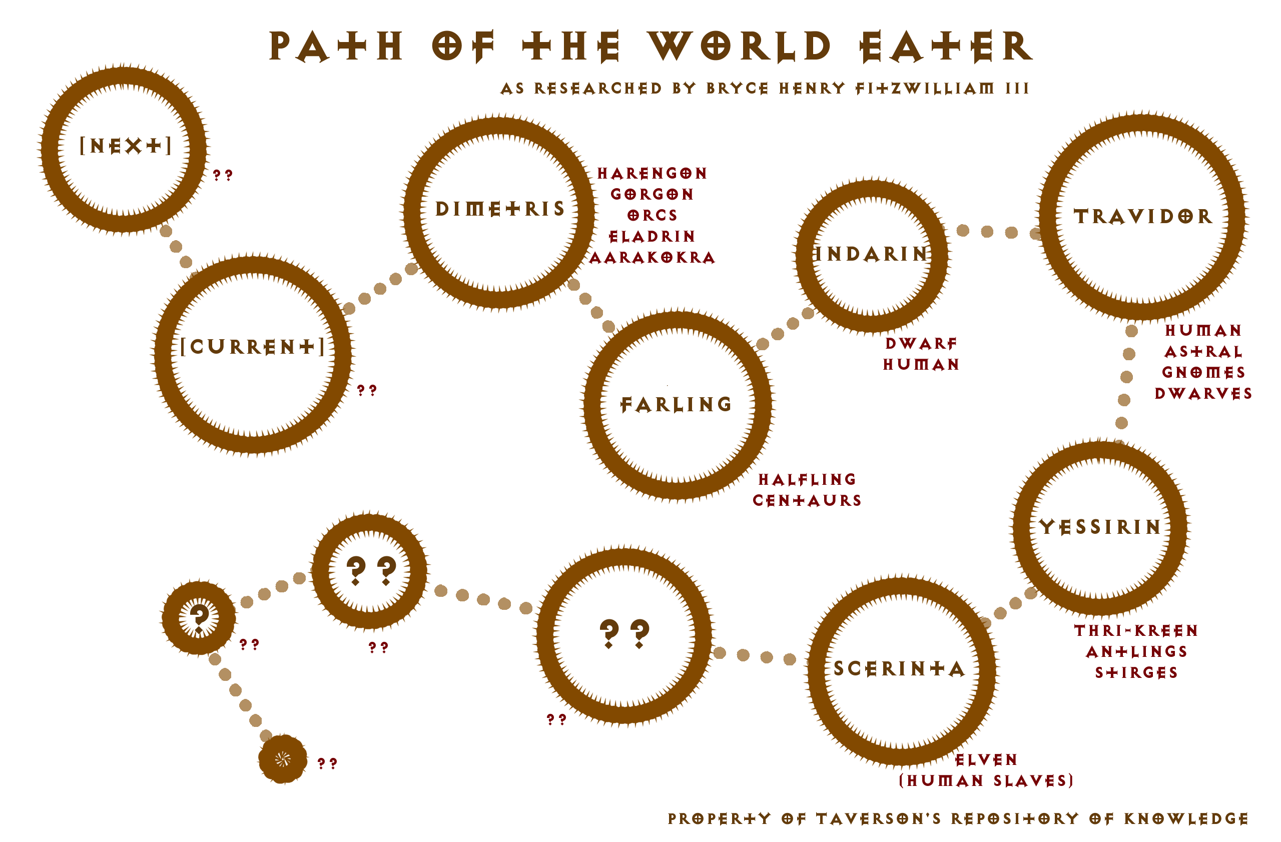 We are talking with Bryce. Bryce Henry Fitzwilliam III. He has a theory of the World Eater. A trader visited a world he expected to do trading on - but only found black and brown sand. Another group went to a different world. Several such entries. He noted when the last time it was recorded to be alive and when it was dead. There’s a series. World eater => (Stormy suggests Amanita). Races were eaten/consumed by the darkness. There’s a timeline. (has map) How long take? 200-500 years. We were told to go back to the beginning. What stage was Verdenhold in? Was what we saw the first step? Was the first step the death of the Great Tree or Frostgrave ? Amanita may still be on the “current” world. There might be scouts beyond Verdenhold for the “next next world”. Our world was in prepwork for Aminta’s arrival? What would it take for a mushroom queen to feel comfortable living in our world? (We share about the pantheon.) This is very dangerous indeed! The pattern suggests and unsatiable appetite. The evil is the only thing left. The balance is off. Complication - the gates tend to fade after the world dies. Will need to find a way to Dimetris. And travel backwards all the way though the chain to the beginning. Theory it should work. Cernan Aelar - sees portals so we should be able to find them. It will be difficult. Possible that people escaped the devoured worlds? May be traveling the planes?