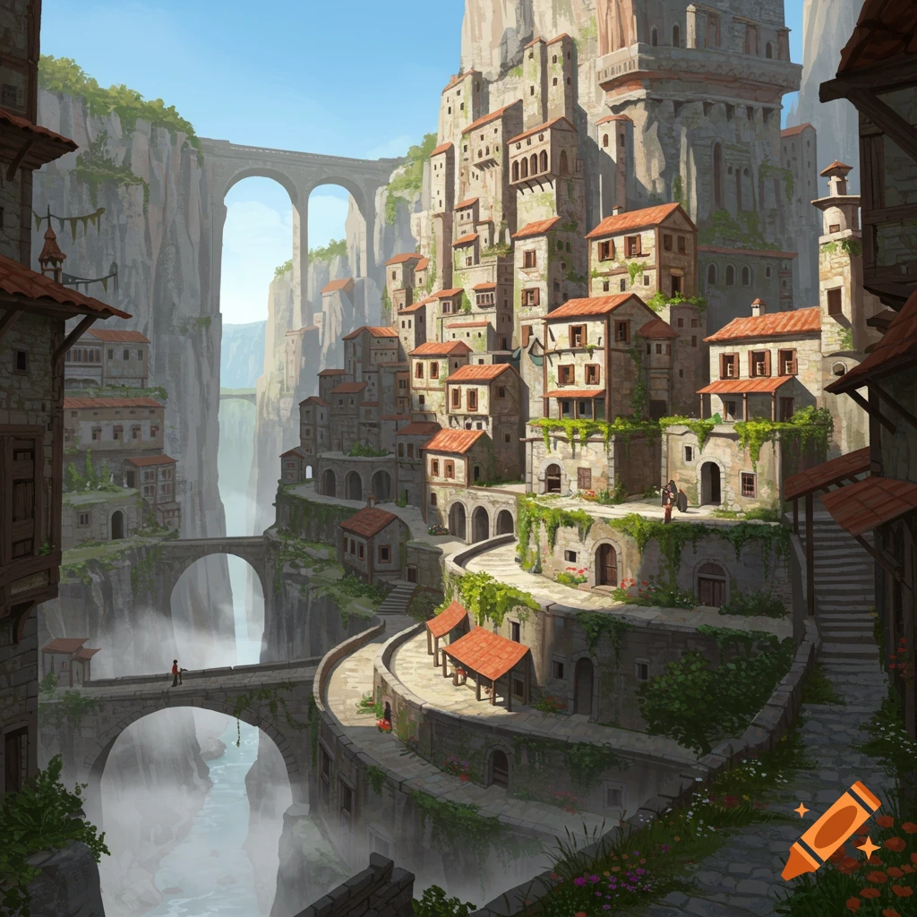 Veluryan is a secretive and peaceful city of the Akreyans in the westernmost mountains of the Southern Lands. Partially carved into the rock of the gorge in which it lies, it is truly an architectural marvel. The city is known for its rock salt mines, whose yields are sold to Middland via the Spice Road.