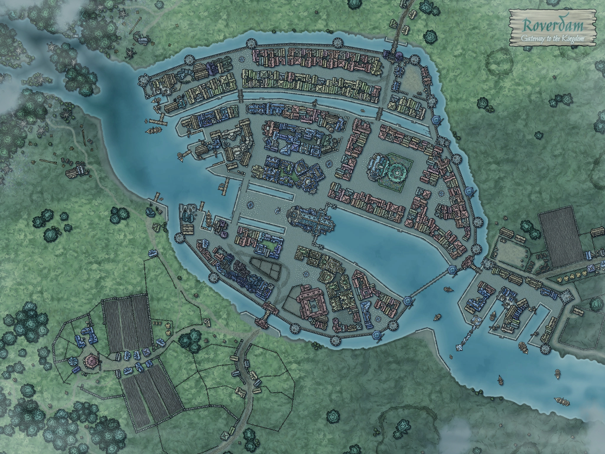 A city built around a dam on the river Rover, at the edge of Deepmarsh.