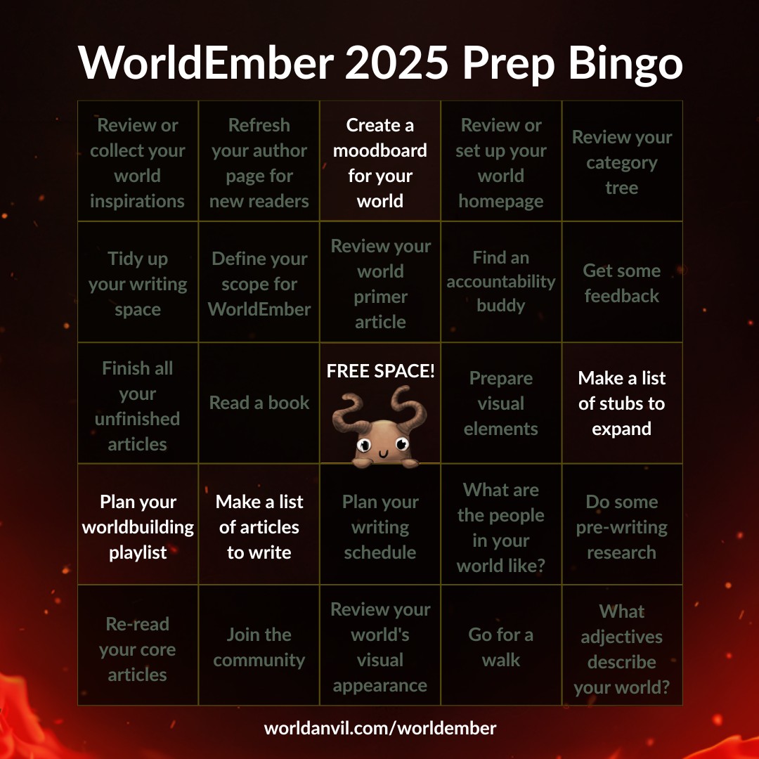 While we were trying to figure out what this article needs to be, we saw Make Lore, Not War's take on the bingo concept and it looks like more fun than the actual assignment so we're sort of stealing it (check out what they're planning here!). We've picked the 5 assignments that fit our workflow best, and will be tracking them here.