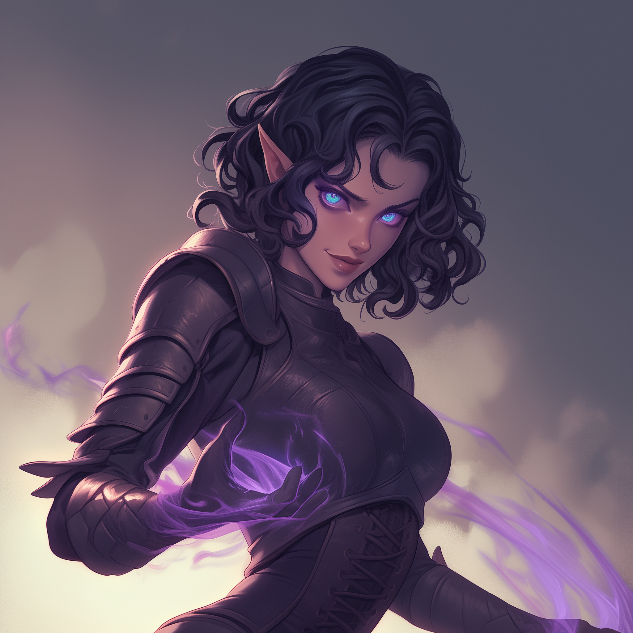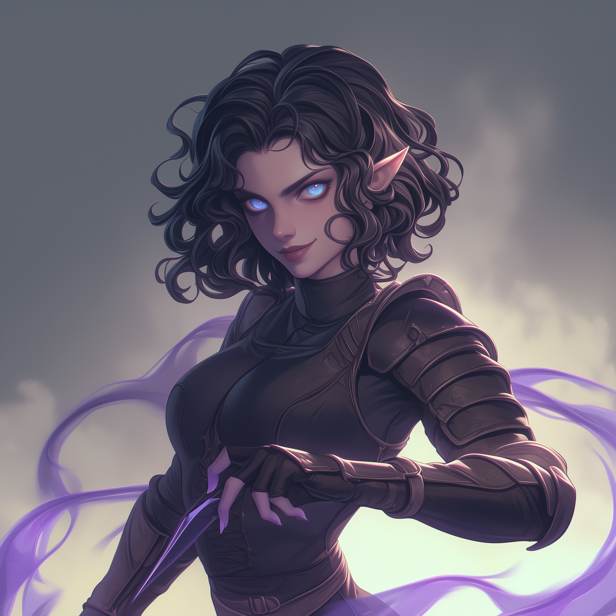 Lysandra is a striking young woman, blending the sharp elegance of her elven heritage with the sharp-witted playfulness of her Asiendalian lineage. She has vivid blue eyes that seem to glow faintly when she calls upon her time magic, and her short, curly black hair frames her mischievous face, often hiding a knowing smirk. Despite her small and agile frame, she carries an air of deadly confidence, a silent predator lurking in the dark. She wears an enchanted assassin’s armor , crafted of shadow-infused fabric that allows her to meld into the darkness effortlessly. Her belt is lined with throwing knives, vials of poison, and small trinkets enchanted with minor spells. Her cursed daggers are always within reach, pulsing with a faint violet glow.Personality