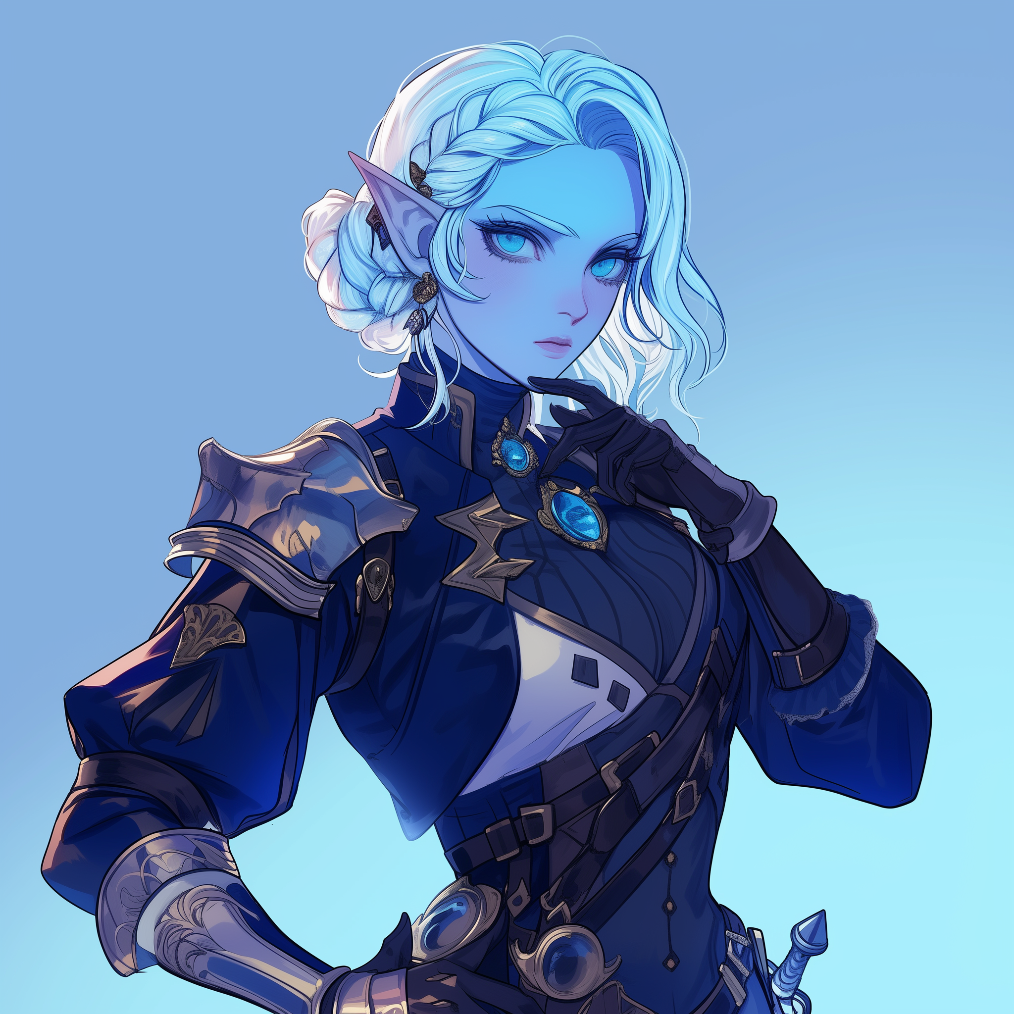 Nimhra Kathraen is a light pale blue–skinned ice elf with features touched by Asiendalian blood. Despite her youthful maturity by Asiendalian standards, her beauty carries an almost natural serenity — a grace inherited from her ice elf lineage. Her pale blue eyes gleam with a mix of smug intellect and quiet sadness. She dresses practically, often with soot- or grease-stained gloves, belts of tools, and a collection of prototype devices clipped to her attire.Personality
