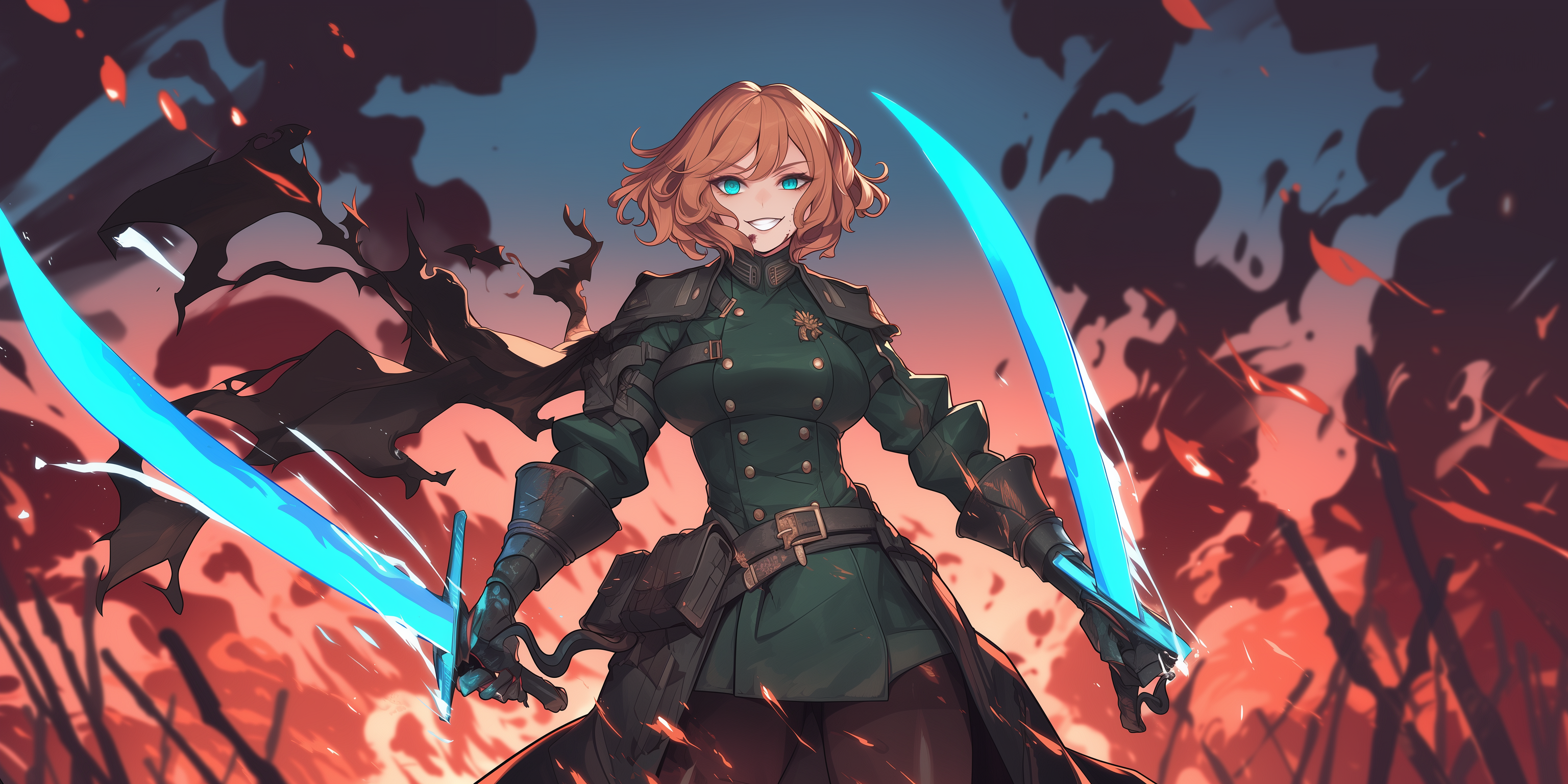 Sellina's appearance is both striking and commanding. Her heterochromatic eyes—one green and one blue—set her apart and hint at her unique abilities. Her short, light brown hair adds to her practical yet stylish look, often seen in fashionable military attire that reflects her martial prowess. Height: Tall, with a strong and athletic build. Build: Muscular and fit, ideal for her intensive combat style. Eyes: Heterochromatic—one green, one blue. Hair: Short and light brown, complementing her practical and stylish military attire.Equipment and Skills