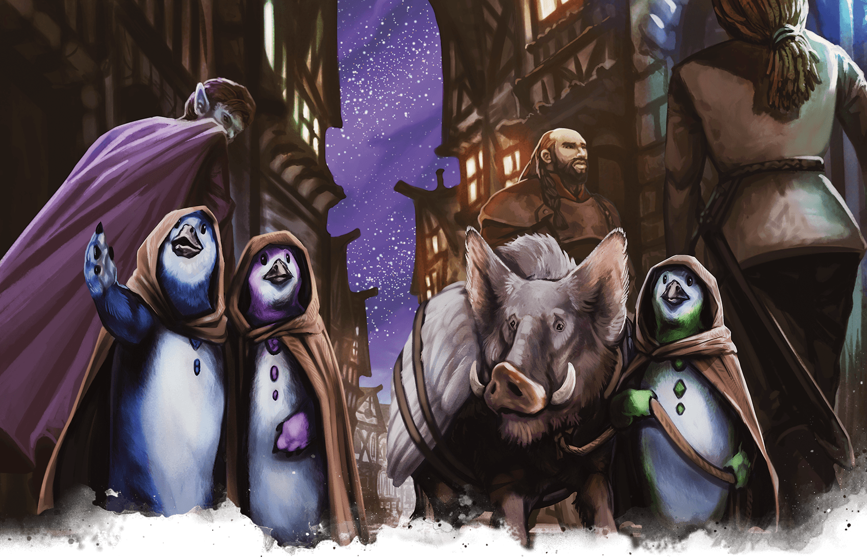 Dohwars are short, pudgy, flightless avians that look and move like penguins. Dohwars migrate from the Feywild to Wildspace, where they are typically encountered. They conduct their affairs in secrecy, preferring to meet in dark alleys and out-of-the-way places even when their business isn’t illegal or dangerous. They tend to dress in a garish mishmash of clothing, but many of them also shroud themselves in hooded cloaks.