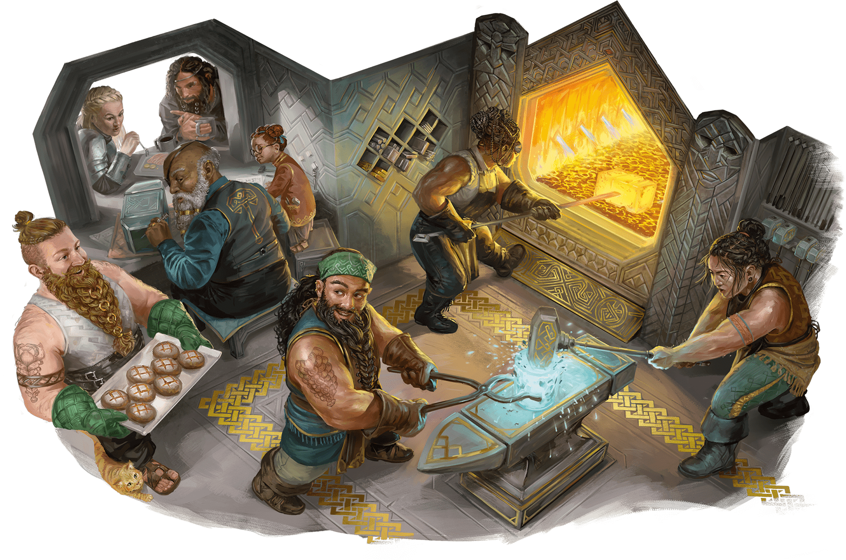 Dwarves were raised from the earth in the elder days by a deity of the forge. Called by various names on different worlds—Moradin, Reorx, and others—that god gave dwarves an affinity for stone and metal and for living underground. The god also made them resilient like the mountains, with a life span of about 350 years.