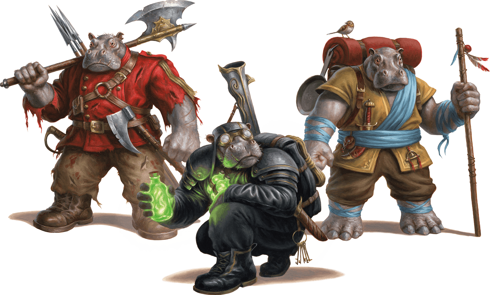 Giff are tall, broad-shouldered folk with hippo-like features. Some have smooth skin, while others have short bristles on their faces and the tops of their heads. As beings of impressive size and unforgettable appearance, giff are noticed wherever they go. Giff put their great size to use in all sorts of ways, from lifting heavy loads and tying tight knots to opening stuck doors and seeing over crowds. They’re also natural swimmers.