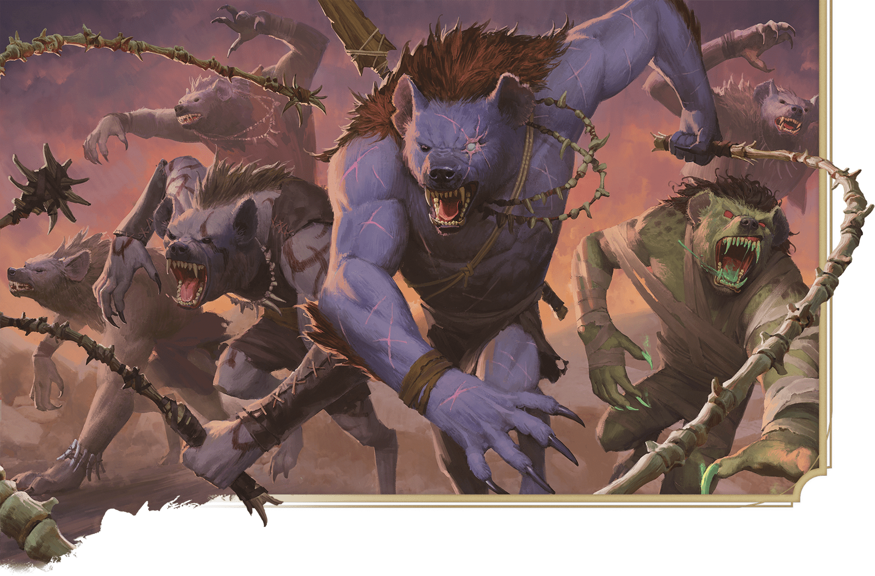 The first gnolls arose from hyenas that fed on flesh tainted by the Abyss. Their corruption and violence delighted the demon lord Yeenoghu, who encouraged their numbers and spread them across the multiverse. Ever since, gnolls have been the cackling servants of Yeenoghu, existing to cause ruin and to feast on what remains.