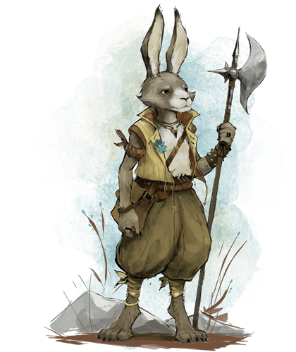 Harengons are bipedal, with the characteristic long feet of the rabbits they resemble and fur in a variety of colors. They share the keen senses and powerful legs of leporine creatures and are full of energy, like a wound-up spring. Harengons are blessed with a little fey luck, and they often find themselves a few fortunate feet away from dangers during adventures.