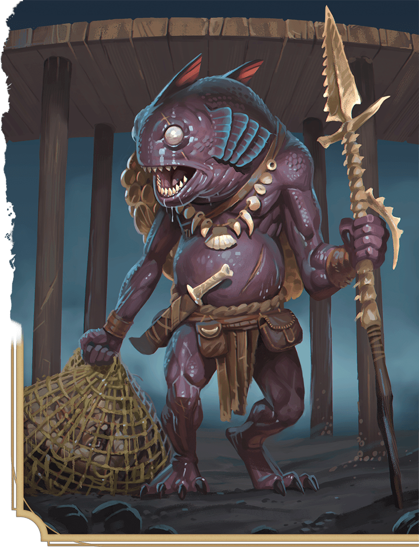 Kuo-toa have slimy, humanoid bodies and the heads of goggle-eyed deep-sea fish. They claim they once dominated whole worlds, their empires spanning land and sea under the blessings of piscine gods. The kuo-toa can’t say what disaster brought their glorious civilization to an end, but elves, humans, mind flayers, and the kuo-toan gods bear the brunt of their blame. From the lands and seas of the surface, the kuo-toa retreated into cavernous trenches and Underdark seas. In these hidden realms, kuo-toa brood over all they’ve lost and forgotten, nursing plots to avenge themselves for slights that might never have occurred.