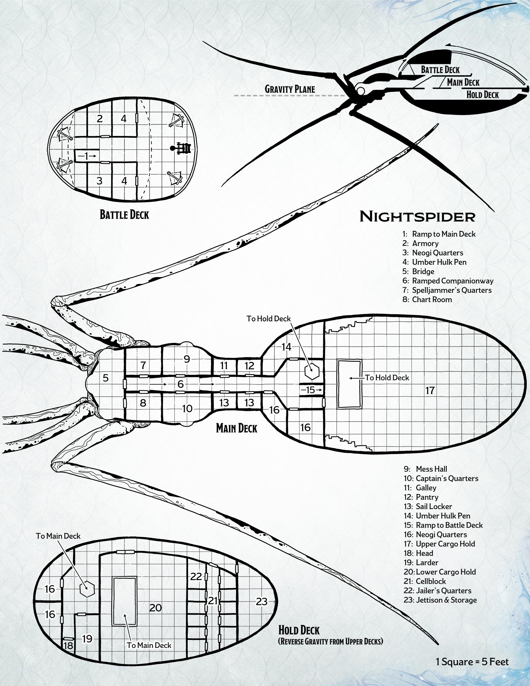 Nightspiders are designed for space travel alone and can’t float on water or land safely on the ground (the weight of the ship would snap its spindly legs, destroying its weblike rigging in the process). Standard weaponry on a nightspider includes four ballistae (two forward-facing and two aft-facing) and a forward-facing mangonel.