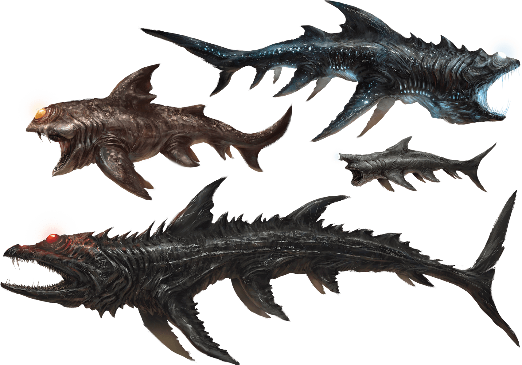 Scavvers are shark-like scavengers that fly through space, feeding on whatever they can fit in their mouths. Scavvers are not always aggressive; often they trail behind larger creatures as well as ships and asteroids, living off droppings and discarded refuse. They can enter the air envelopes of these bodies, so that as their “host” moves (often at high speed), the scavvers keep pace. The lesser varieties—brown and gray—rarely rise above the level of nuisances. The larger varieties are more formidable, in part because they often don’t wait for their meals to come to them.