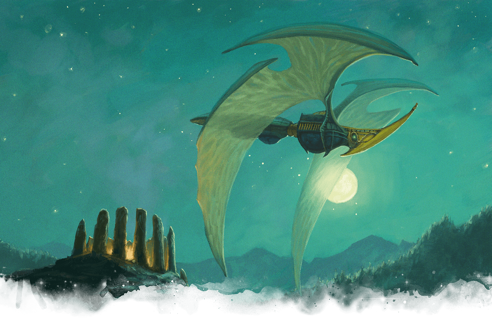 A star moth’s hull is fashioned from a grown and sculpted organic substance, and its enormous, decorative wings are made of shimmering crystal. The vessel is built for space travel, but its design does enable it to float on water or land safely on the ground. Standard weaponry includes two ballistae nestled in the star moth’s eye holes and a mangonel mounted above the bridge.