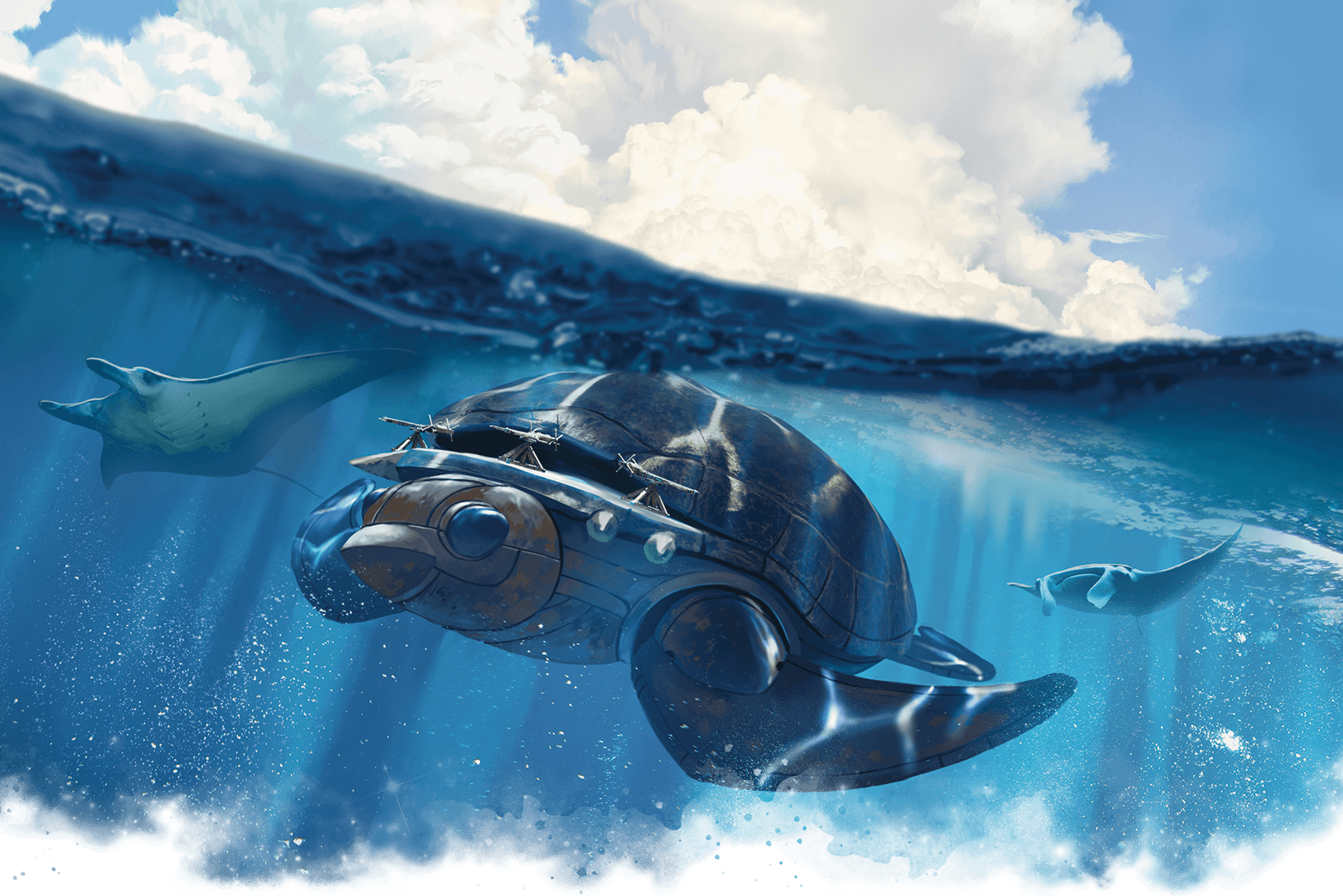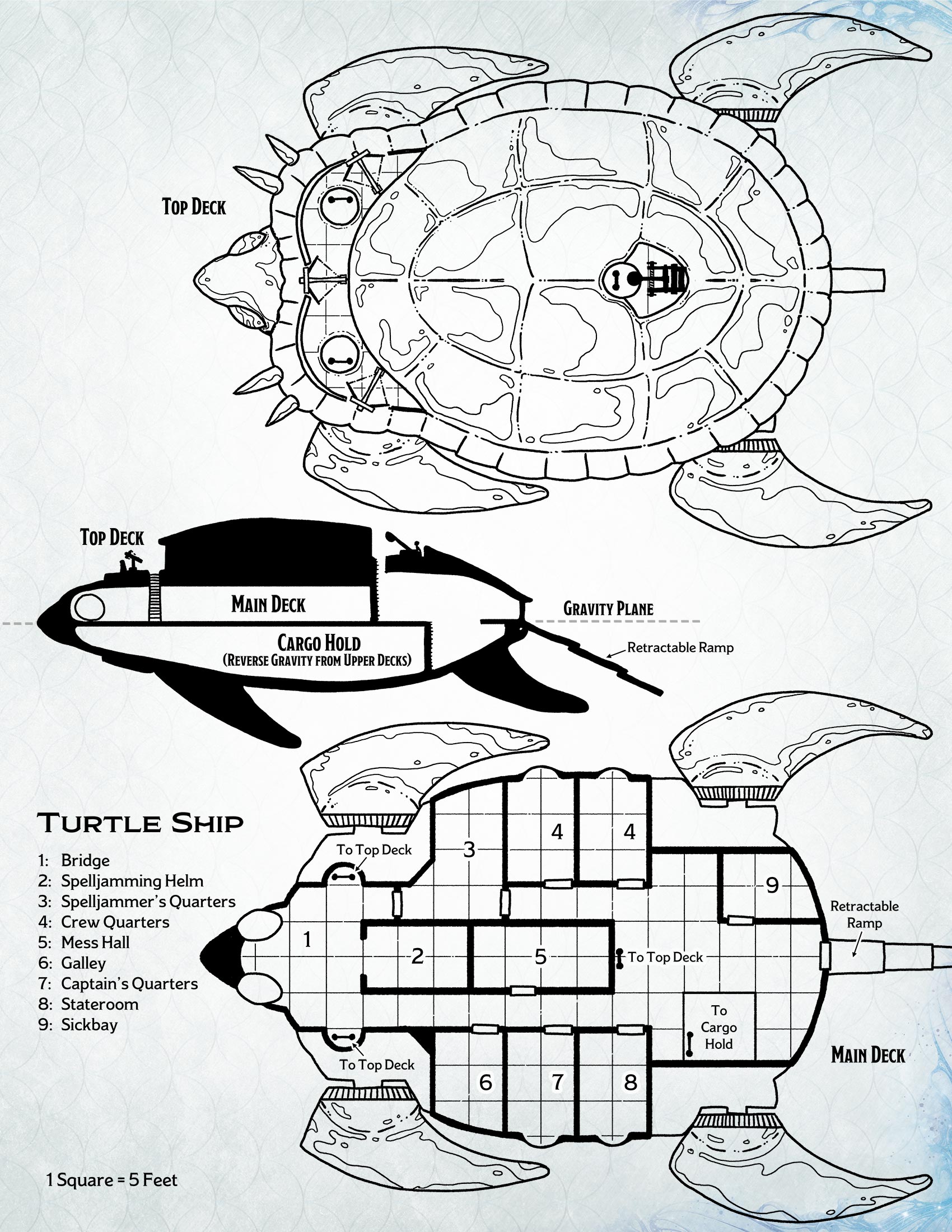 A turtle ship is encased in a protective metal shell, as befits its name, and bristles with weapons. In addition to its roomy quarters, it can carry a decent-sized payload, making it popular among traders and others who need a lot of cargo space. The ship can land on the ground, and it floats on water. Sliding panels can be closed to make the hull airtight, enabling the ship to travel underwater safely, even to great depths. If the ship takes damage while on or under the water, interior hatches can be sealed to prevent the ship from flooding completely.