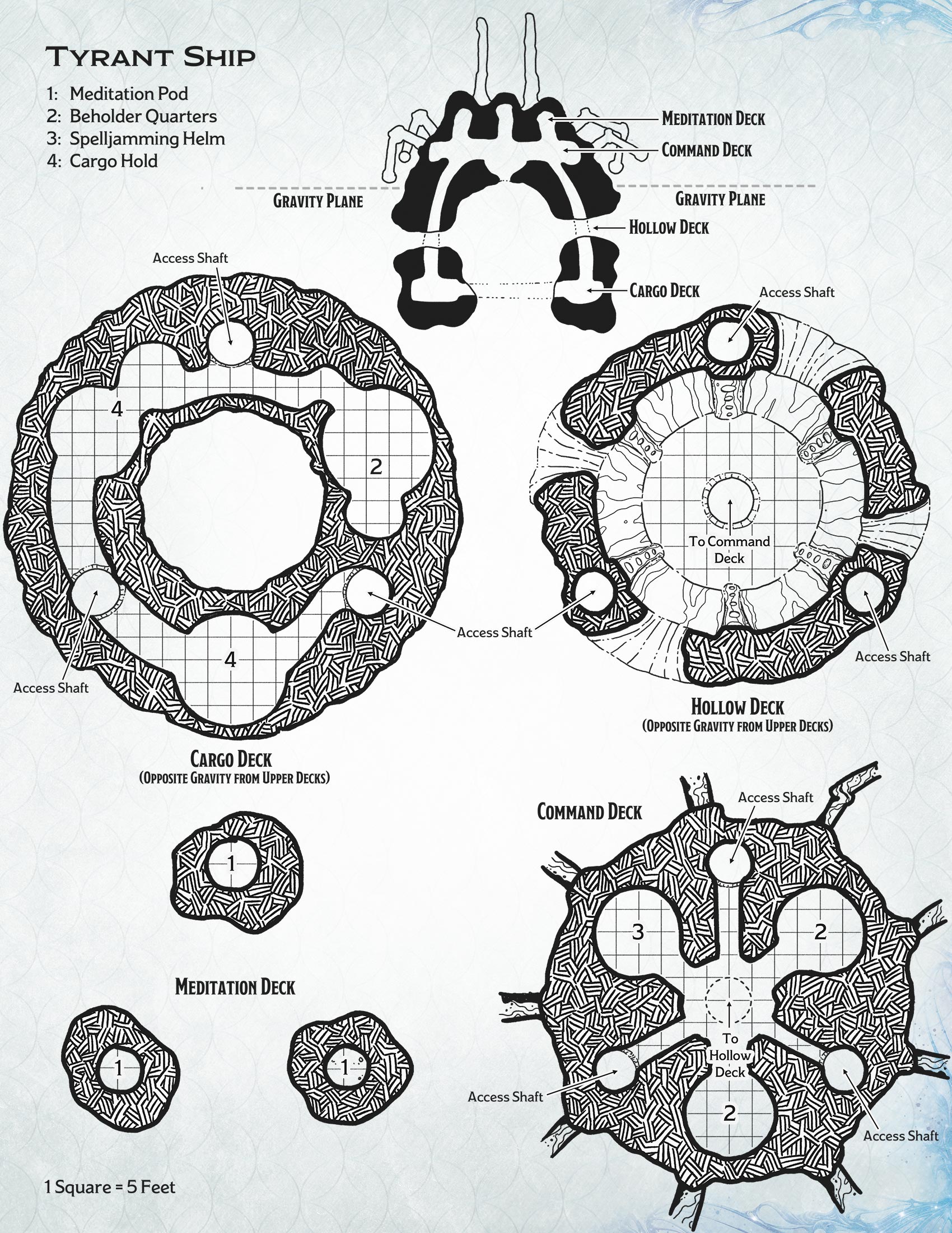 A spherical chamber on the ship’s command deck functions as a spelljamming helm that only beholders can attune to. Any beholder that occupies this chamber can attune to it. Reducing a tyrant ship to 0 hit points not only destroys it but also destroys the ship’s spelljamming helm and eyestalk cannons.