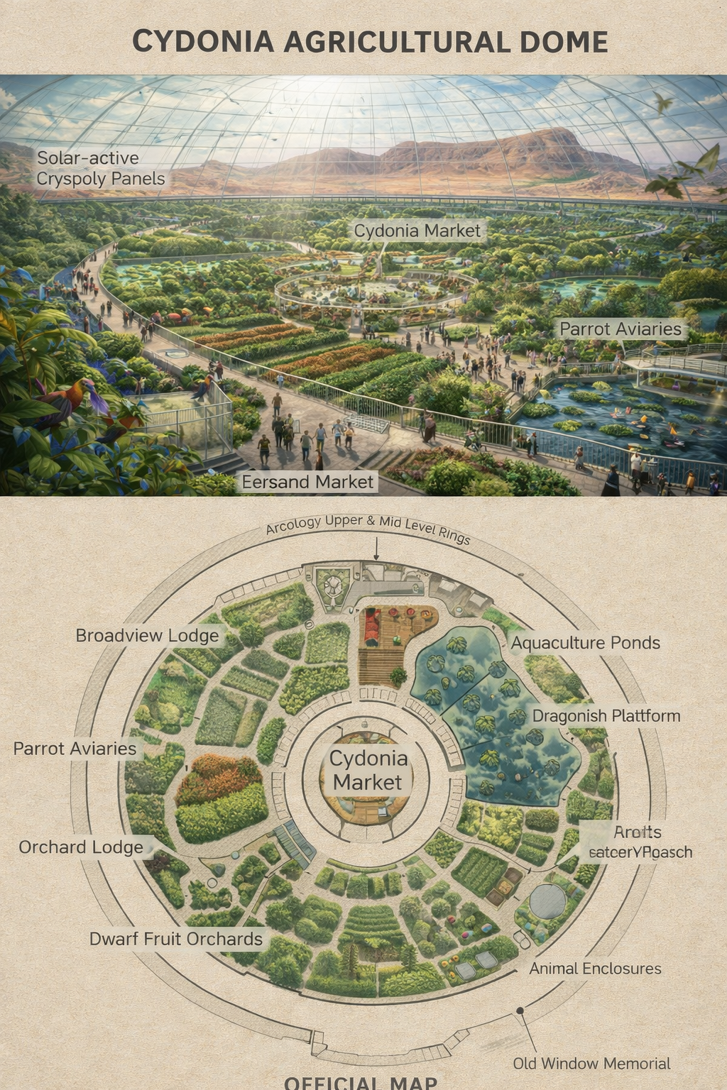 A vast enclosed biome containing farms, orchards, animal enclosures, aquaculture ponds, and the Cydonia Market itself.