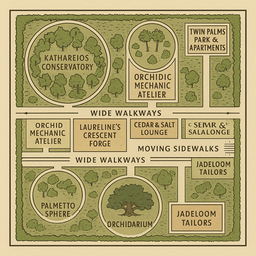 A palm-heavy biome with low ponds. Popular for morning tai-chi and sunset strolls. AI drones monitor all biometrics; non-residents are “redirected” instantly.