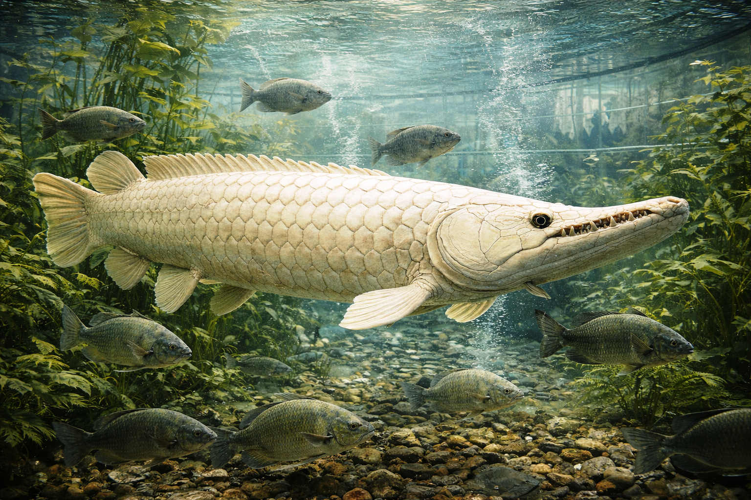 Ivory gar are a sterile, gene-modified freshwater apex fish derived primarily from alligator gar stock, with additional stabilizing sequences introduced to control aggression, growth rate, and remove reproductive capability. They are not ornamental animals. They are a managed predator species deliberately integrated into large aquaponic ecosystems.