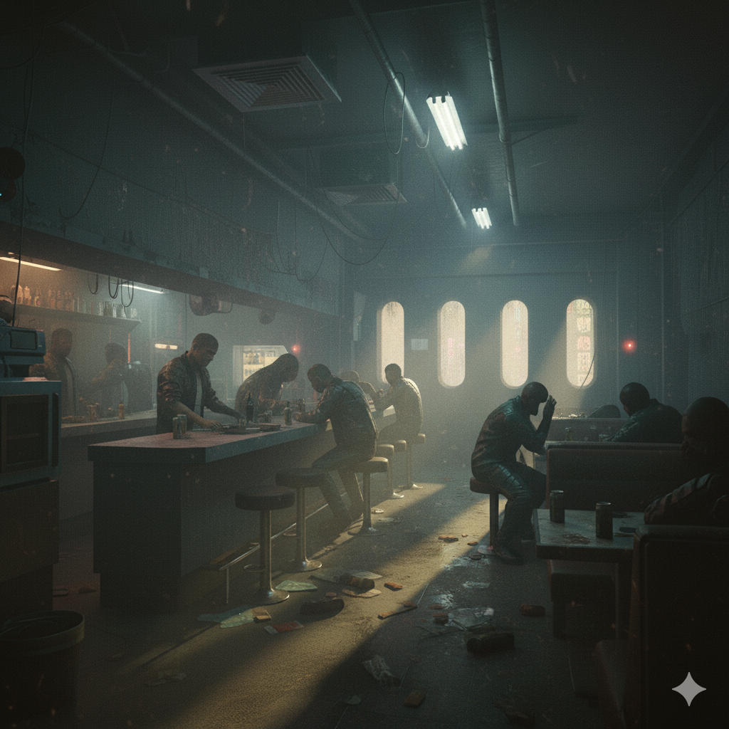 The air in Niles' bar was its usual toxic stew—stale beer clung to decades-old composite flooring, layers of unwashed bodies radiated sweat and desperation, and smoke billowed, dense with cheap narcotics and engineered tobacco blends. Just another Tuesday, she thought, a bitter taste coating her tongue, in the cesspit they call 'entertainment.'