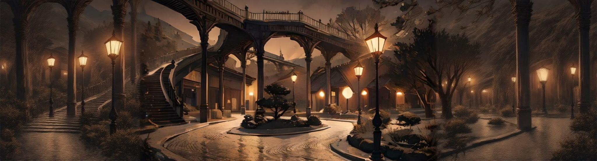 Situated at the very heart of Orphan Heights, beneath the suspended Heuridium Tower, lies Bellamy Park, the largest recreational and "natural" area within Orphan, rivaled only by the Agromatic Gardens in Rimsbury. Riddled with elevated Limeiron footbridges, winding brick strollways, statuary, and all varieties of once-native trees, the park is a favourite locale of romantic-intentioned pedestrians and the like, and was the first location fully illuminated by Lectral Incandescents, thanks to the labours of the Corps. of Lectral Incandescent Transitioning eager to prove the merits of this newfangled "light bulb" to the populous.