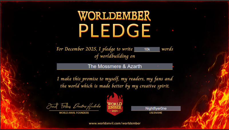 1. Define the scope of your worldbuilding for WorldEmber: I'm going to tackle two different worlds this December, primarily a new world that I just started, called The Mossmere, as well as my main world of Azarth. For the Mossmere, it's going to be creating those core documents for the setting and characters. In Azarth, I'd like to expand the articles in my stubs folder from Summer Camp.