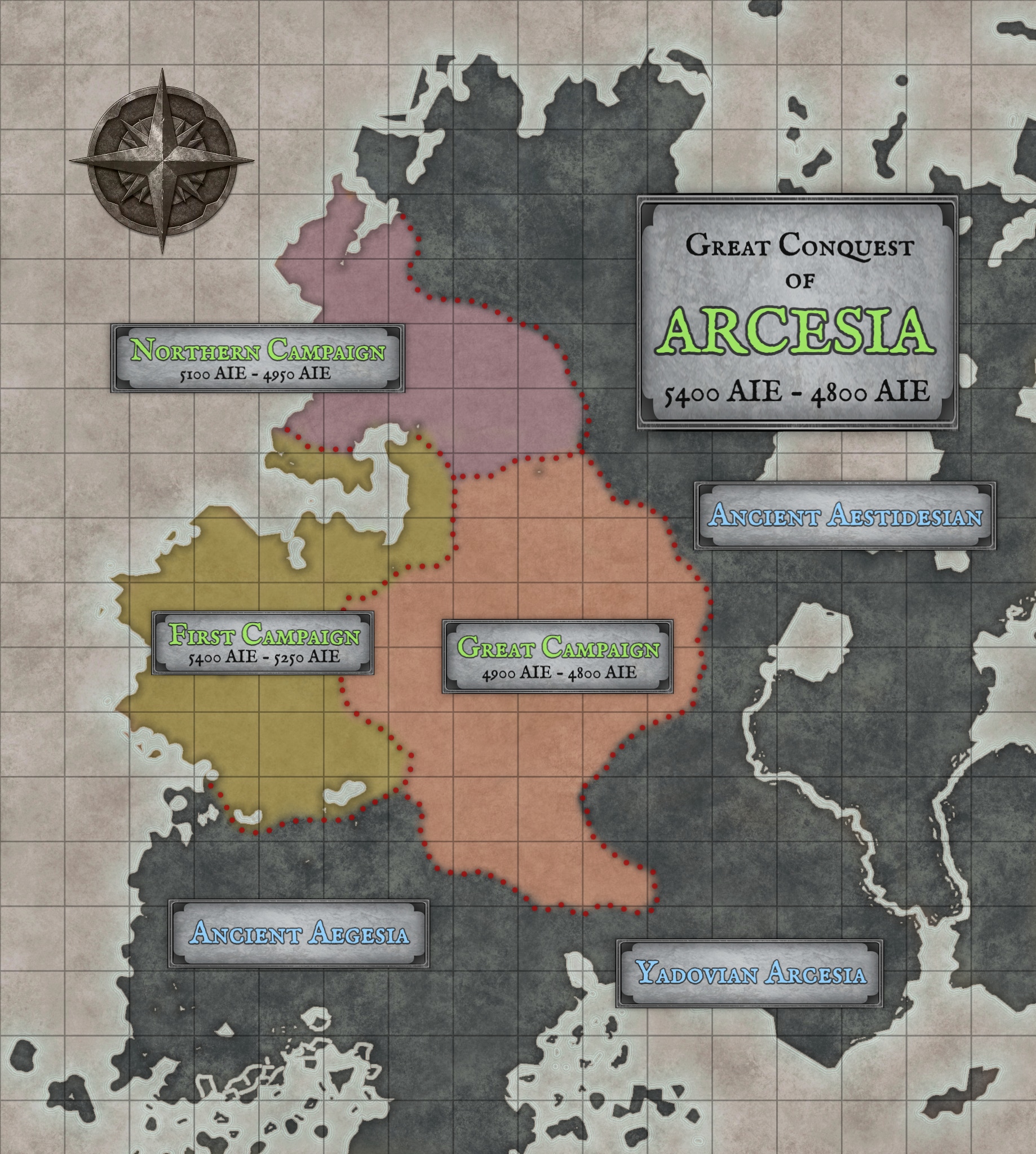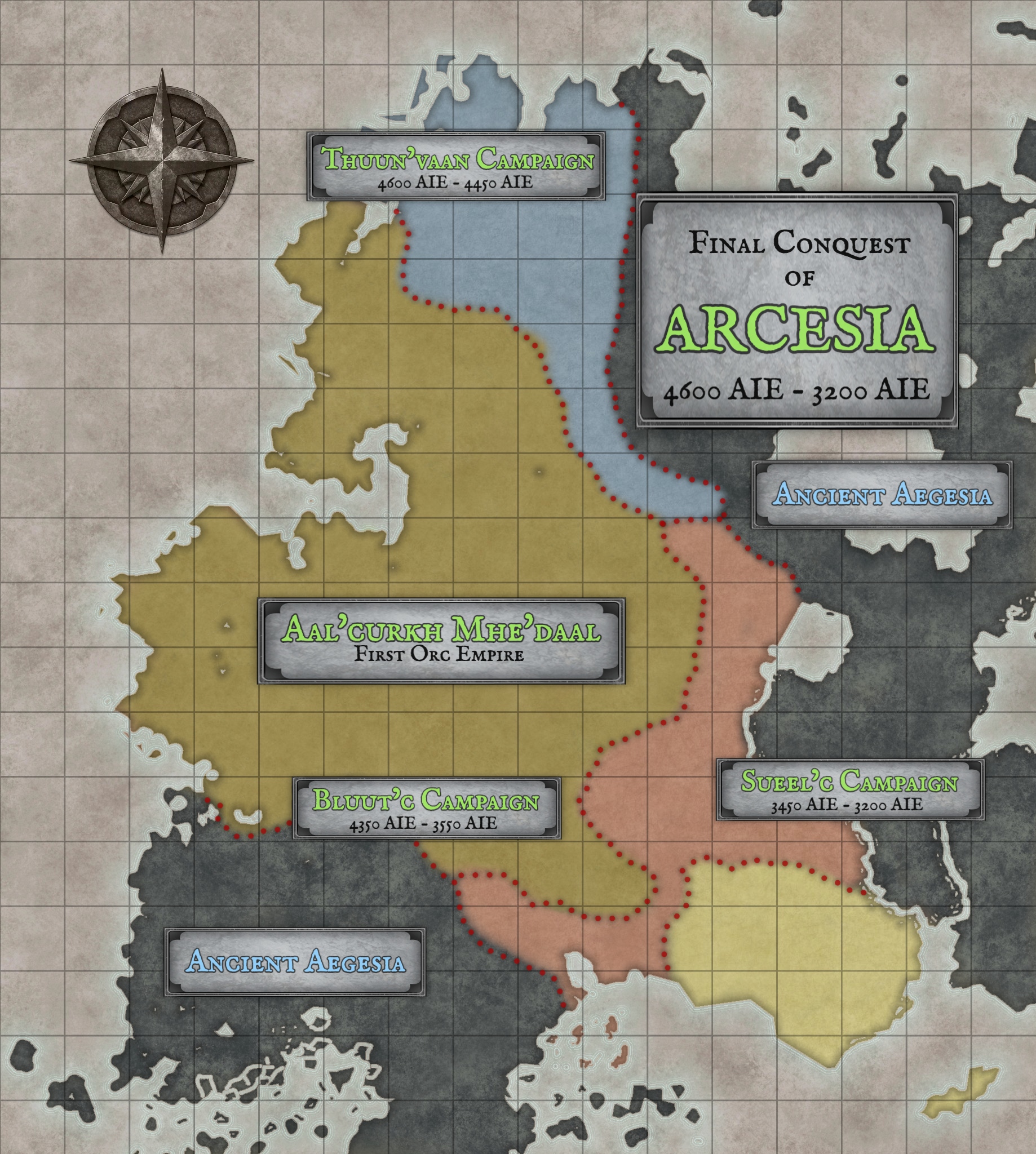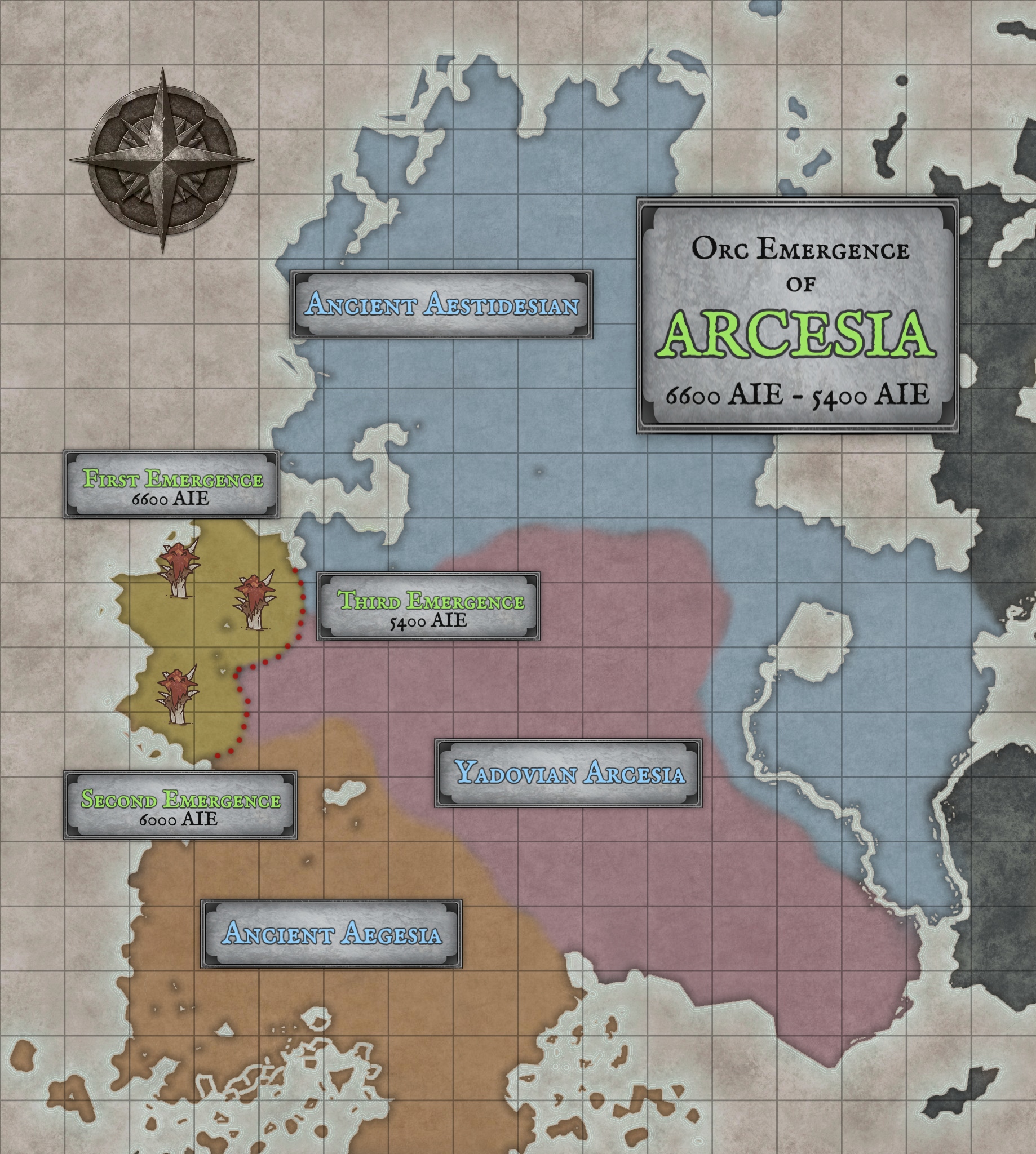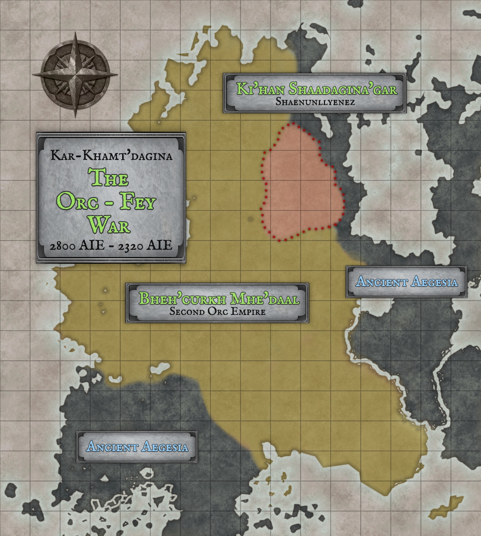 While located on the eastern edge of Acarcia, the truth is Arcesia stands at the heart of a volatile geopolitical battlefield. The continent is bordered to the northeast by the titanic unyielding peaks and bloody lowlands of Aestidesia. Across the roaring Ghan'fuort, the "King of Rivers" that divides eastern Acarcia from the west, lie the imperious center of all Terran civilization, Aesersia. Further southeast, distant Arthesia sends countless corsairs across the Pugnausean Sea to raid Arcesia's southern shores and island strongholds, while the twin continental empires of Aegesia and Aquilesia press ever-eastward against the wartorn western frontiers. The foreign Terran powers that dominate much of Acarcia continue their centuries-long struggle to reclaim Arcesia from the War Orcs, aided by the nomadic Urchal and Topen tribes who still roam their ancestral homeland, forever resisting the ruthless diaspora forced upon their ancestors. Meanwhile, degenerate Ogre raiding parties rush from the southern Aestidesian lowlands like a vicious mudslide into the Arcesian heartland to seize captives for their infamous carnivals of blood. Lastly, the frigid Unseelie Fey of Shaenunllyenez hold the continent's deepest and wildest northeastern forests as one of their Feygate Sanctuaries, the infamous Wicked Watch. This region remains unclaimed by either the War Orcs of Shaad’engar or the Giantkin of Aestidesia. These alien and brutal fey maintain a wary, conditional "peace" with the War Orcs, bound only by their mutual and unyielding hatred of the Terrans and Giantkin of eastern Acarcia.